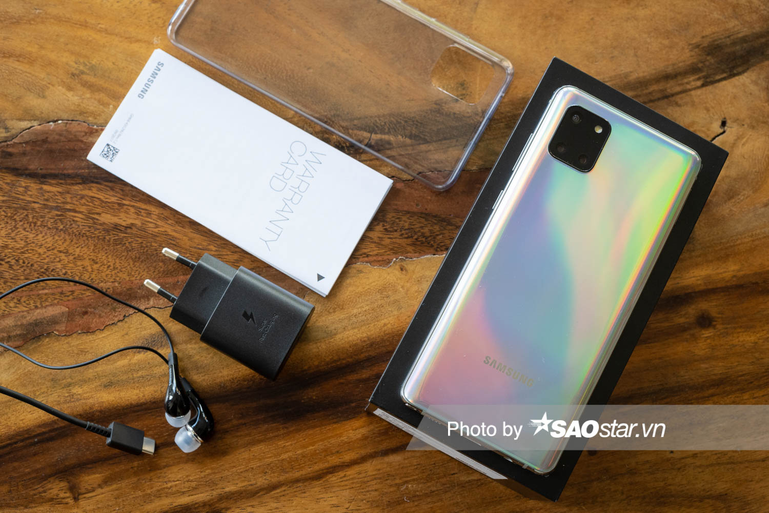 Hộp đựng Galaxy Note10 Lite cũng rất giống với đàn anh Note10 trước đó, với cây bút S Pen báo hiệu màu sắc của máy. Hộp đựng có củ sạc nhanh 25W, cáp C-to-C, tai nghe in-ear (không phải AKG), ốp lưng nhựa, sách hướng dẫn, que chọc sim và tất nhiên là cả Galaxy Note10 Lite.