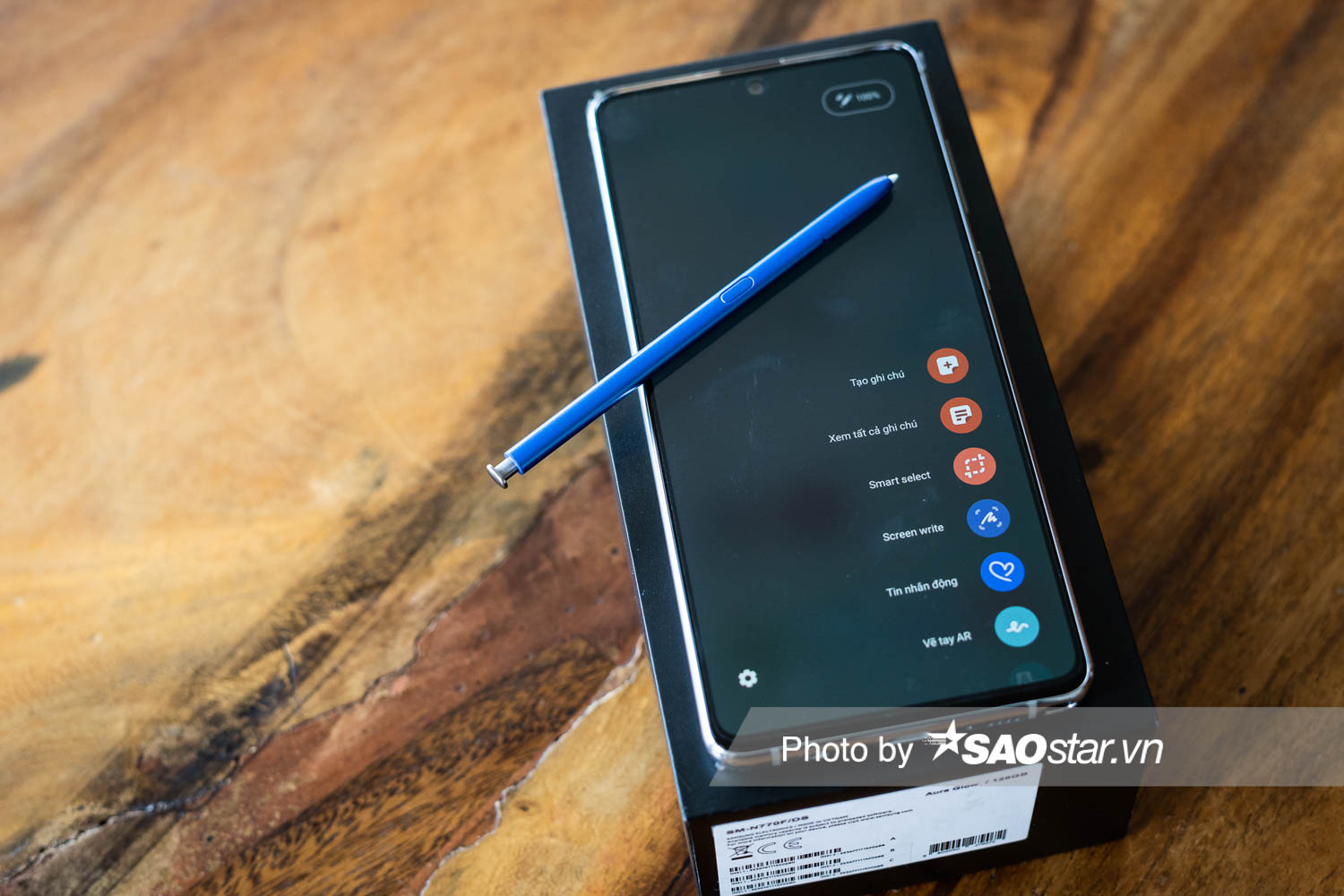 Một điểm cộng khác trên Galaxy Note10 Lite là đi kèm cây bút S Pen. Chiếc bút này vẫn hỗ trợ thao tác viết, vẽ, cũng như tiện ích Air Command sử dụng kết nối Bluetooth để điều khiển nhạc, chụp ảnh từ xa.
