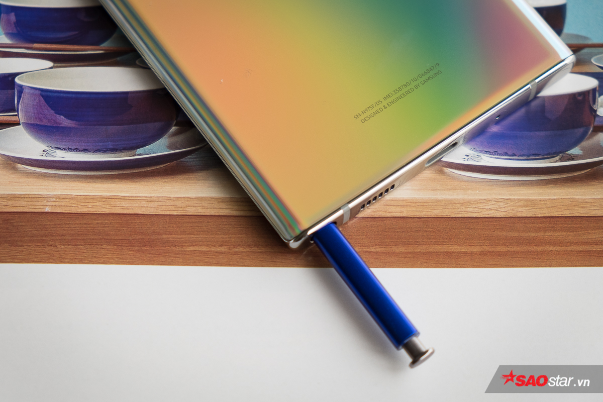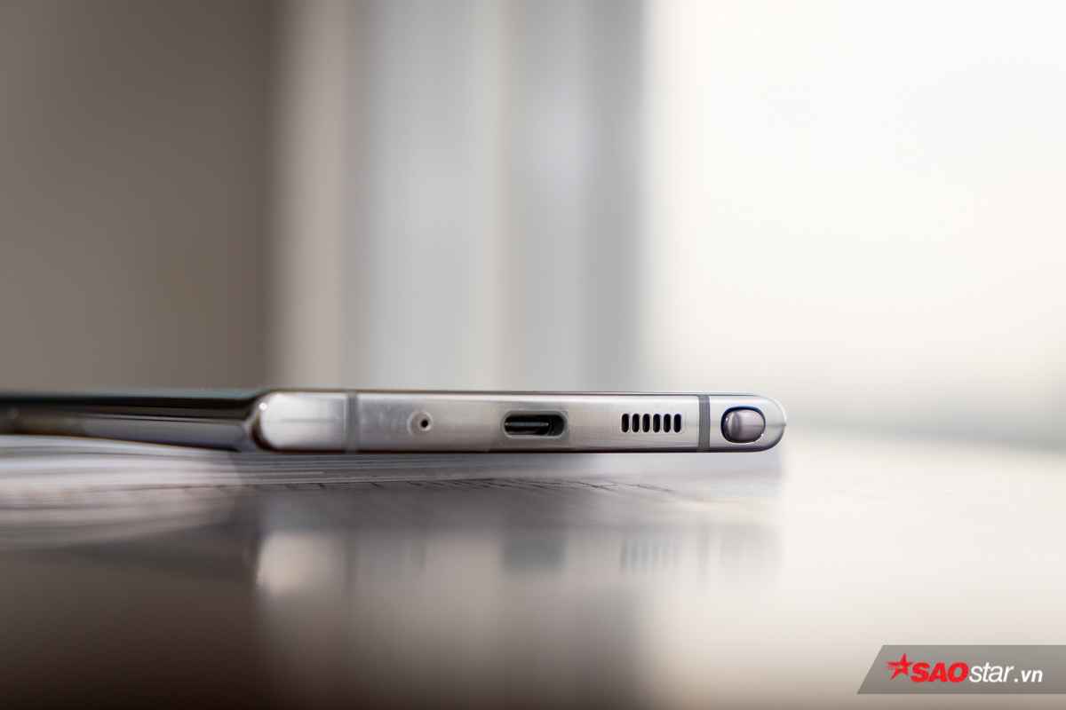 Đuôi máy được Samsung bố trí mic thoại, loa, cổng kết nối USB Type-C và khe cắm nút S-Pen. Có thể bạn cũng đã nhận ra jack cắm tai nghe truyền thống 3,5 mm đã được Samsung loại bỏ. Mặc dù cổng kết nối này vẫn được nhiều người yêu thích, thế nhưng loại bỏ jack cắm này là một xu hướng sẽ ngày càng phổ biến để tối ưu không gian bên trong cho các linh kiện cần thiết hơn.