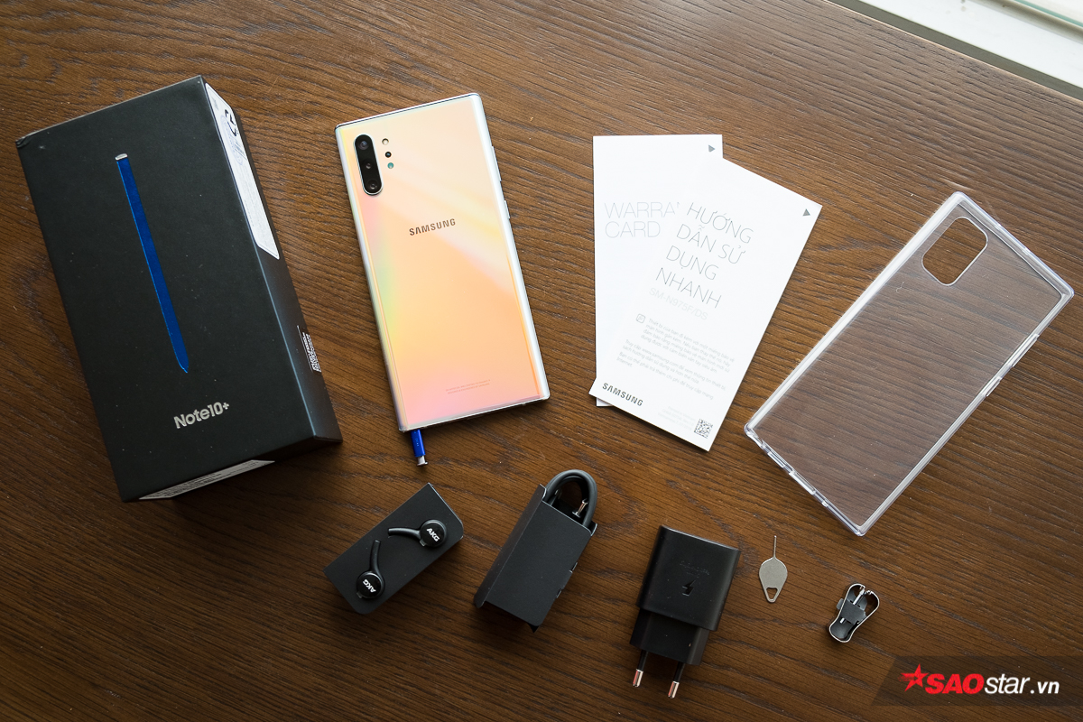 Bên trong hộp máy của Note10+, người dùng sẽ có thân máy, ốp lưng tặng kèm, cục sạc nhanh 25W, cáp sạc, tai nghe không dây AKG, kẹp thay ngòi bút S-Pen, que chọc SIM và sách hướng dẫn sử dụng. Samsung Galaxy Note+ hỗ trợ sạc nhanh tới 45W, dù vậy rất tiếc người dùng sẽ không được trải nghiệm tính năng hấp dẫn này với cục sạc đi kèm máy.