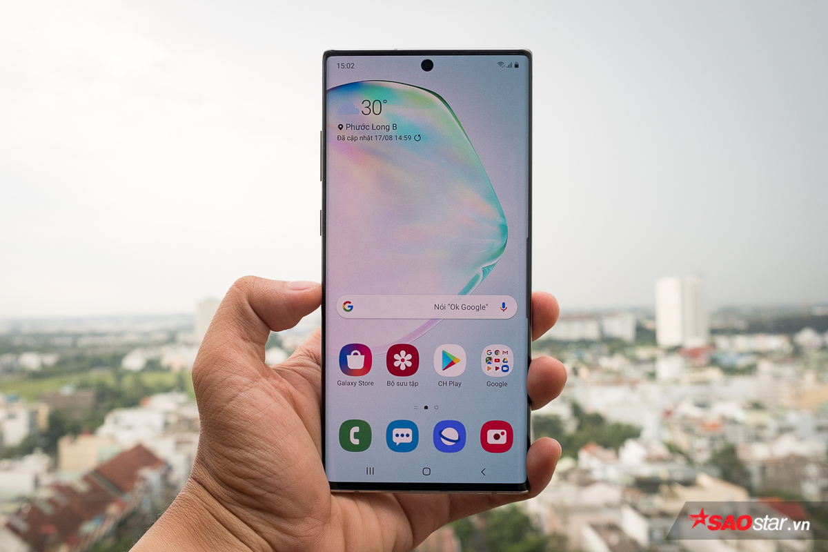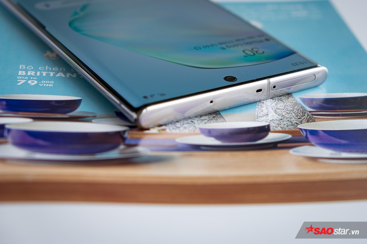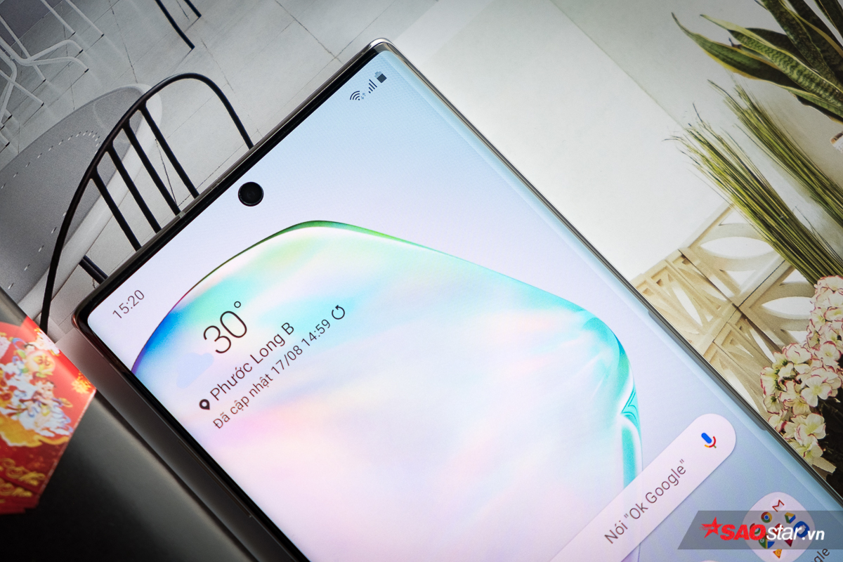 Camera trước thông số 10 MP (f/2.2) của chiếc Note10 được nhà sản xuất này bố trí khéo léo trong một “nốt” cắt nhỏ được đặt ở vị trí trung tâm màn hình theo bề ngang. Với cách tiếp cận này, Samsung giảm tối đa những ảnh hưởng của nó tới trải nghiệm hình ảnh của người dùng, trong khi vẫn đưa tỉ lệ màn hình trên mặt trước của bộ đôi Note lên trên mốc 90%.