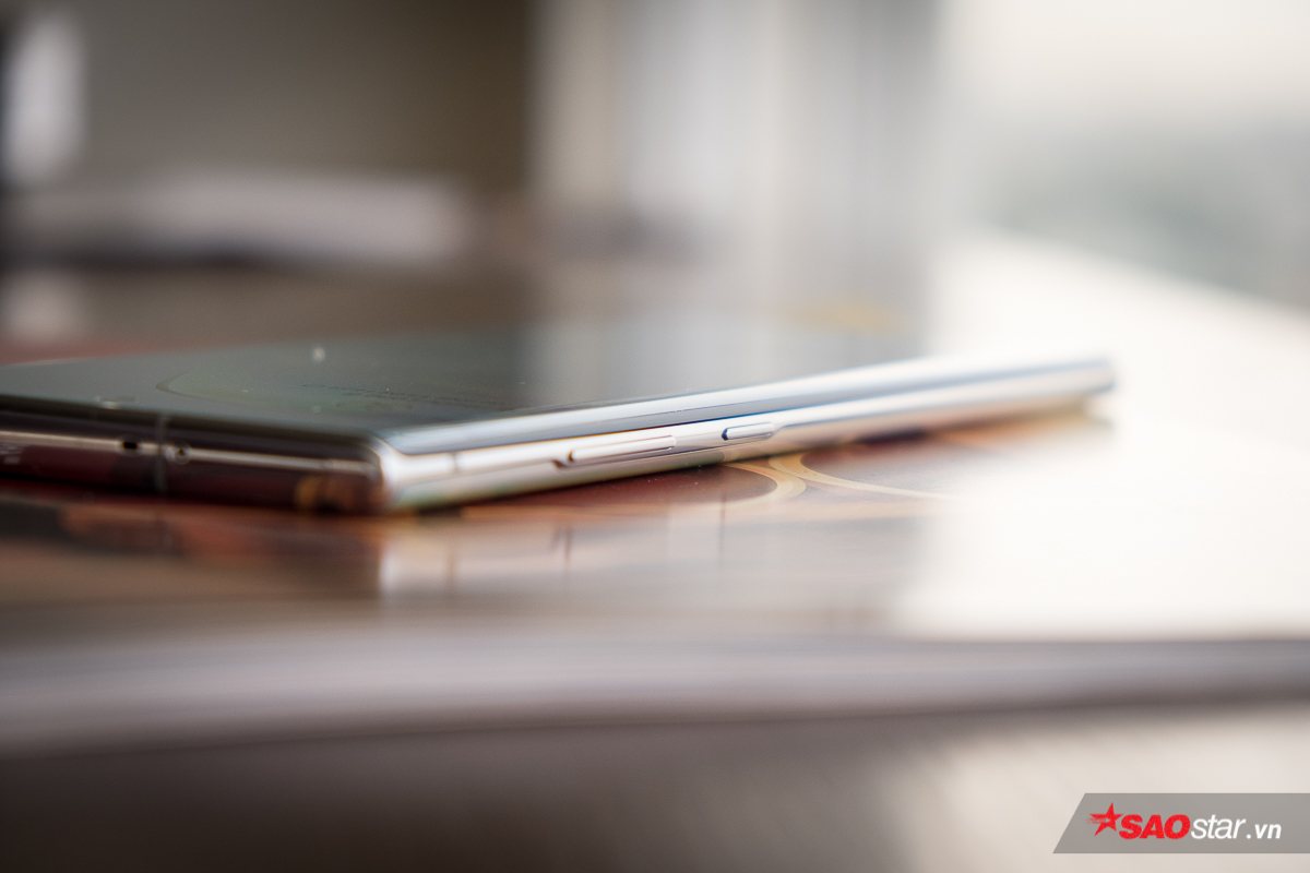 Samsung Galaxy Note10+ có độ dày thân máy 7,9 mm. Sườn trái của máy có nút nguồn và phím tăng giảm âm lượng, trong khi đó sườn phải không có nút bấm hay cổng kết nối nào. Nhìn ở góc này, có thể thấy Note10+ có phần khung máy bằng kim loại siêu mảnh.