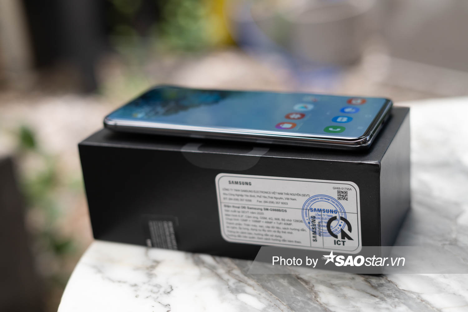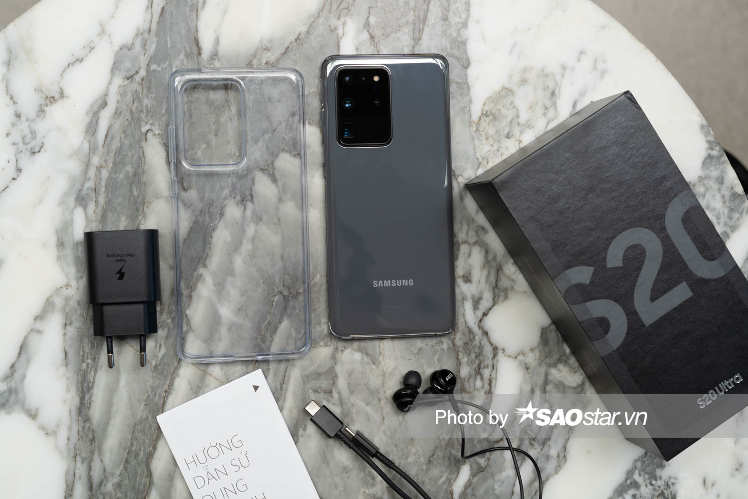 Hộp đựng Galaxy S20 Ultra với tông màu chủ đạo là đen, tương tự các dòng Galaxy S gần đây của Samsung. Bên trong hộp là các phụ kiện đi kèm bao gồm sạc nhanh 25W, tai nghe AKG, cáp USB-C, sách hướng dẫn sử dụng cùng ốp lưng nhựa trong.