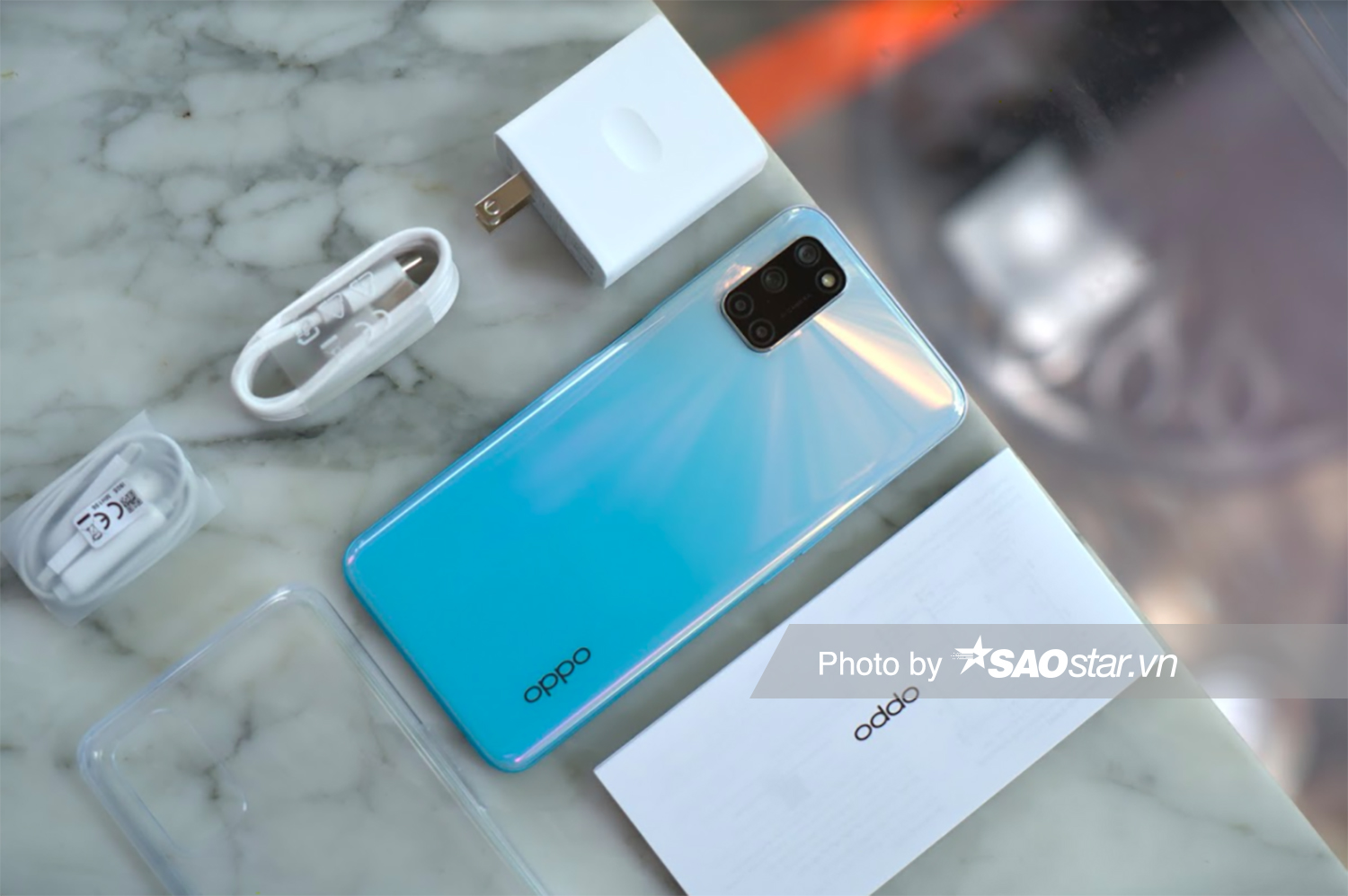 Bên trong hộp máy của chiếc OPPO A92, người dùng sẽ có thân máy, cục sạc, cáp sạc USB Type-C, tai nghe, que chọc SIM và sách hướng dẫn sử dụng. Người dùng còn được tặng kèm một ốp lưng nhựa trong. Điều đáng nói là cục sạc đi kèm chiếc máy là cục sạc nhanh 18W.