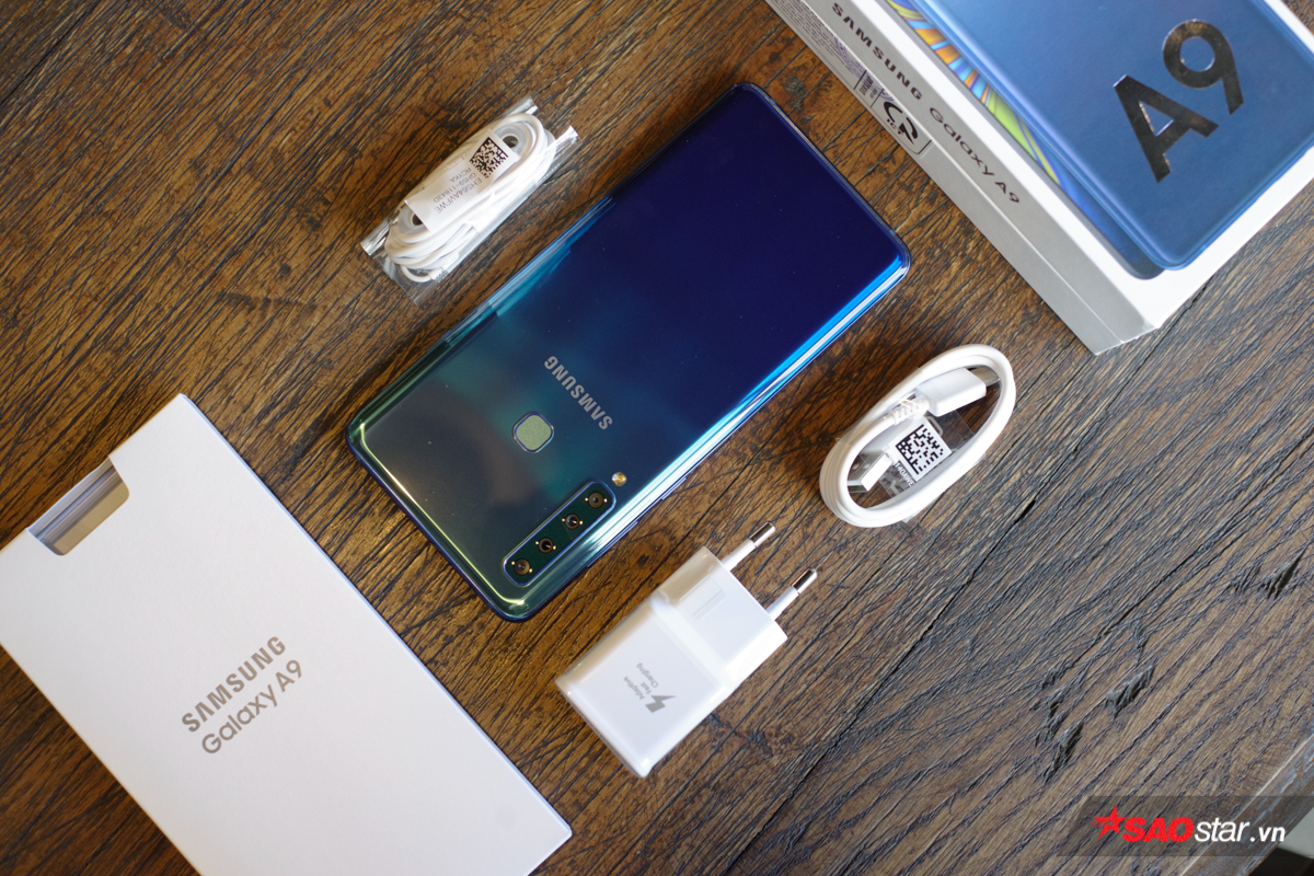 Hộp đựng bao gồm củ sạc, cáp sạc, tai nghe, sách HDSD, một chiếc ốp lưng silicon, que chọc SIM và tất nhiên là Galaxy A9.