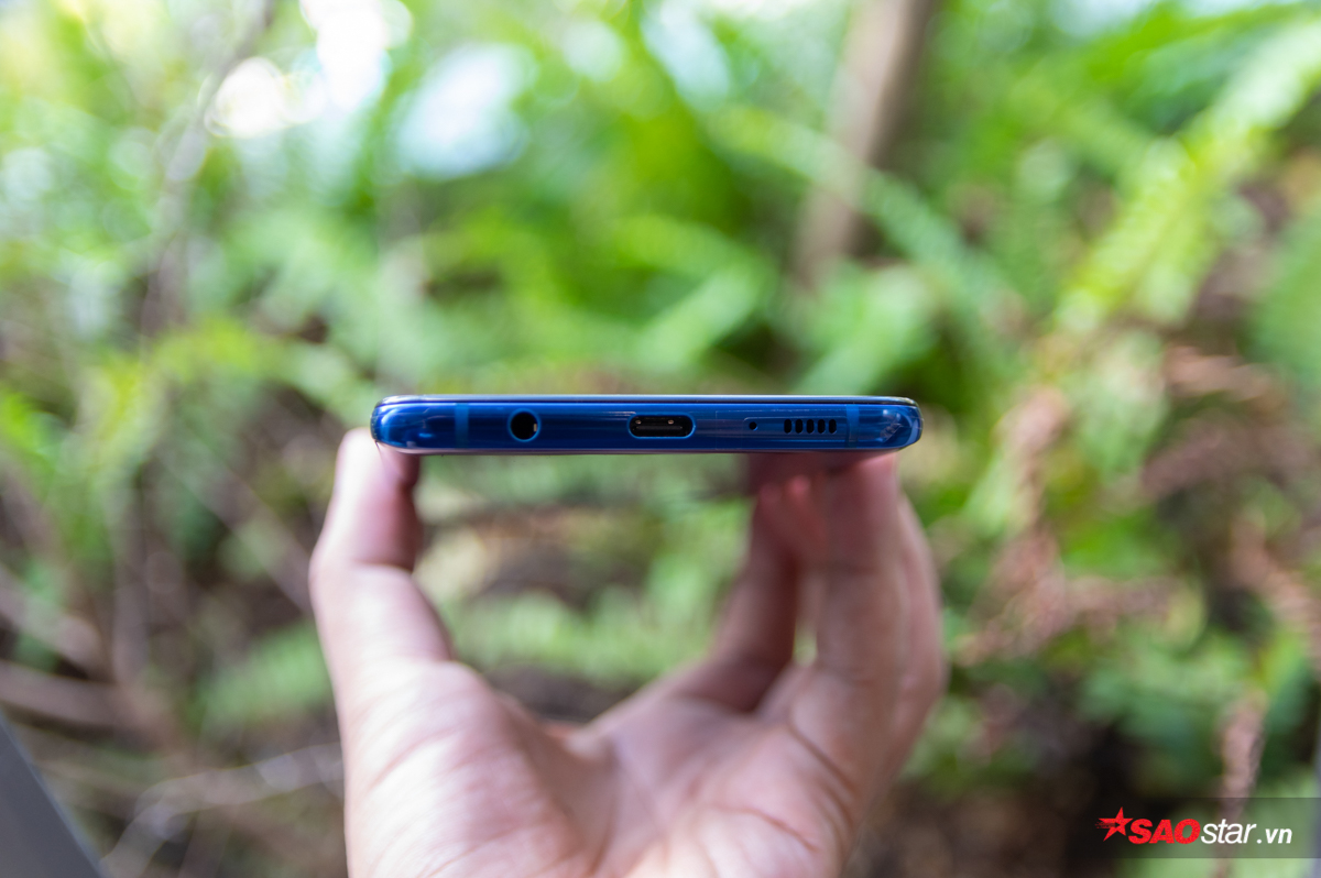 Cạnh dưới máy là hai dải ăng-ten được sơn đồng màu, loa ngoài, micro thoại, cổng sạc USB-C và cổng tai nghe 3.5mm.