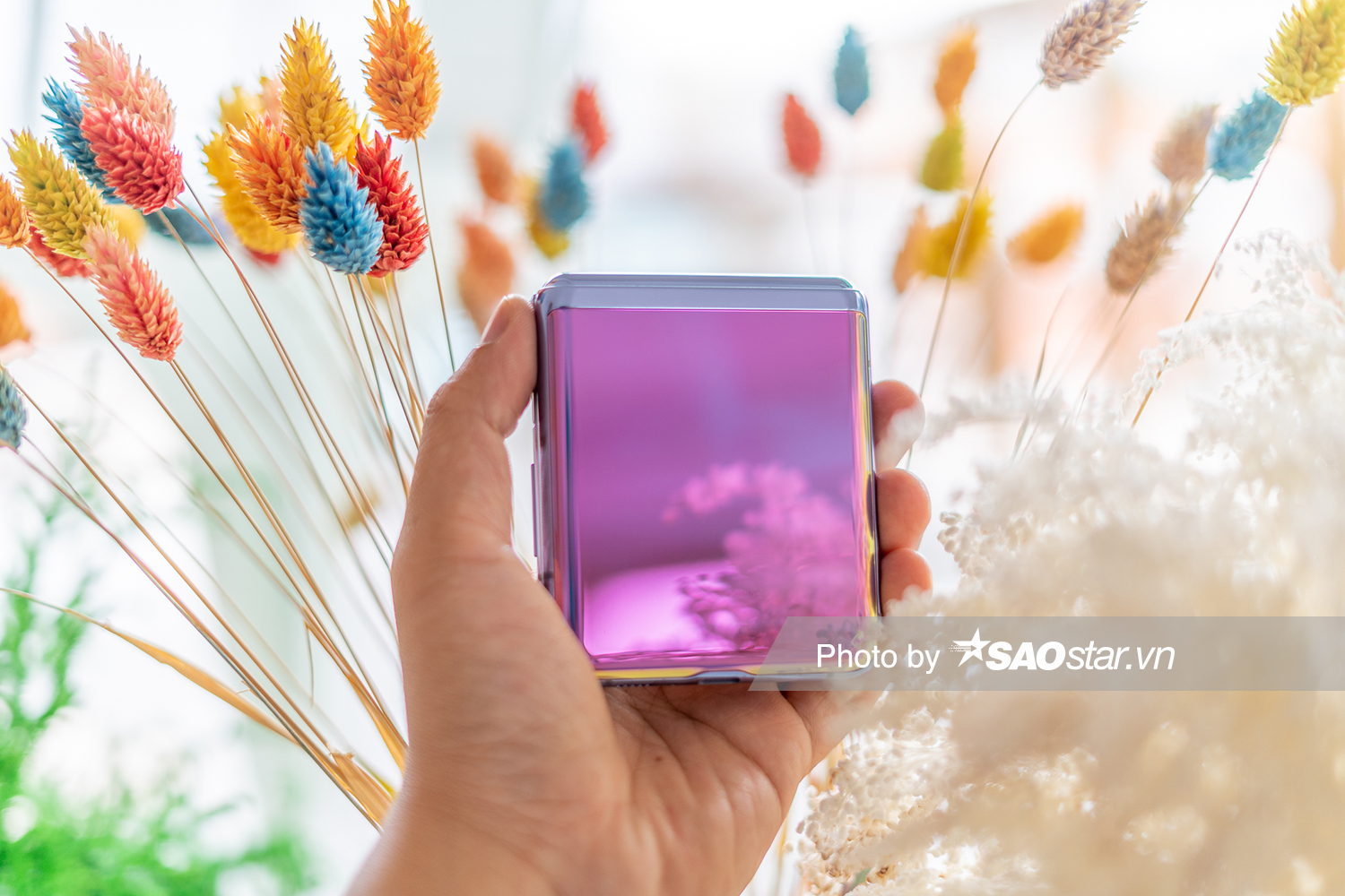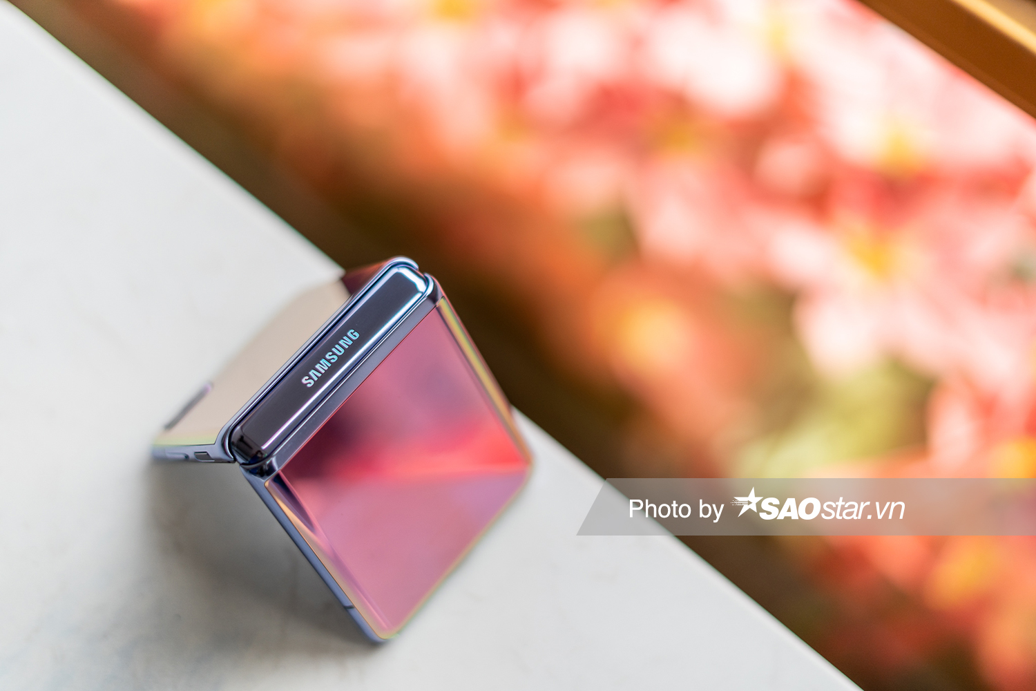 Samsung Galaxy Z Flip có kích thước nằm gọn trong lòng bàn tay ở chế độ gập lại. Máy nhẹ hơn chiếc Fold khoảng 30% song lại có kích thước thân máy dày hơn, khoảng 7,2 mm khi mở ra và 17,3 mm khi gấp lại. Ở góc chụp này, có thể thấy Z Flip có một màn hình phụ nằm gần cụm camera sau. Màn hình này giúp người dùng cập nhật nhanh một số thông tin như giờ giấc, ngày tháng hay thông báo mà không cần mở máy.