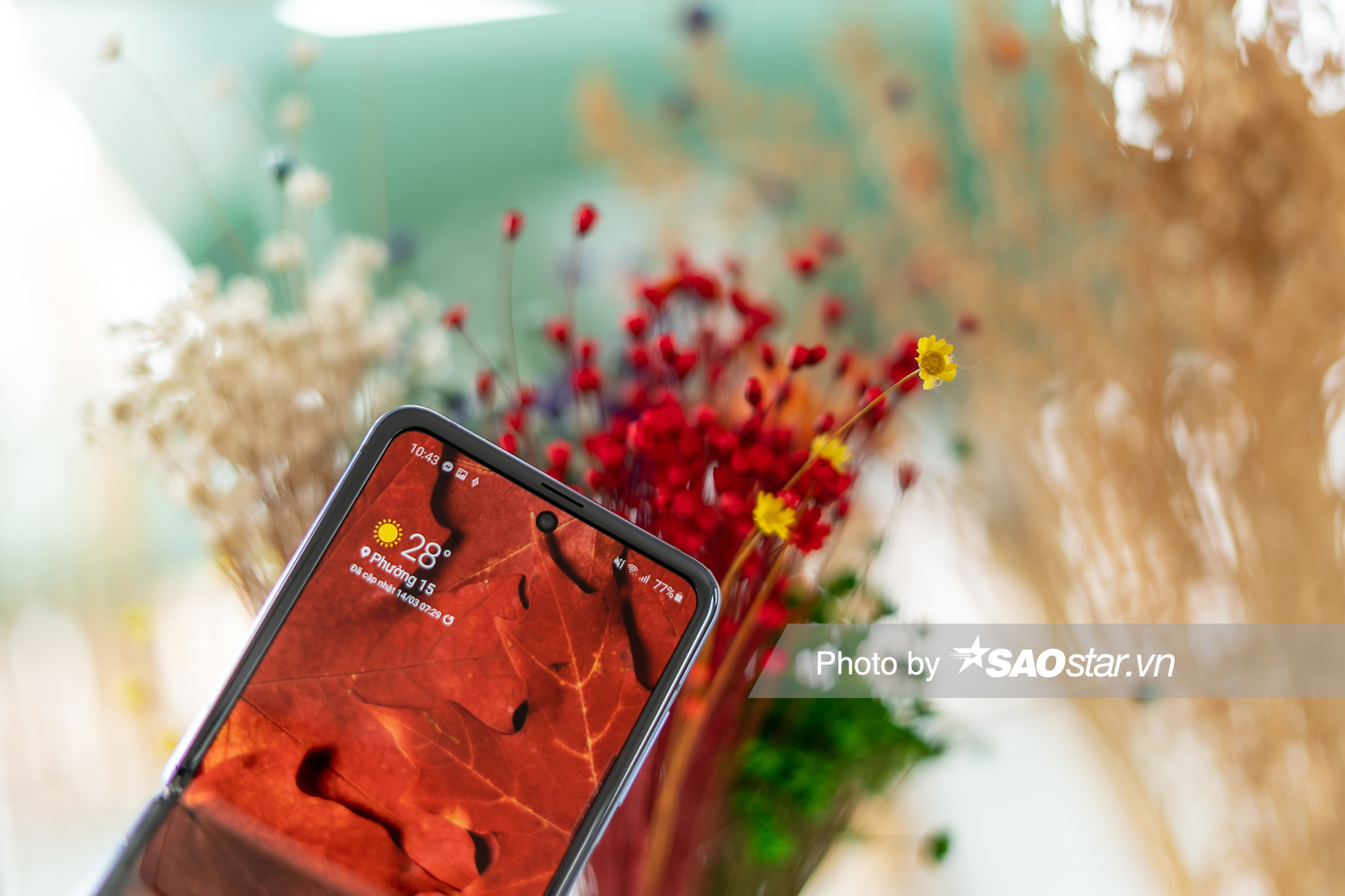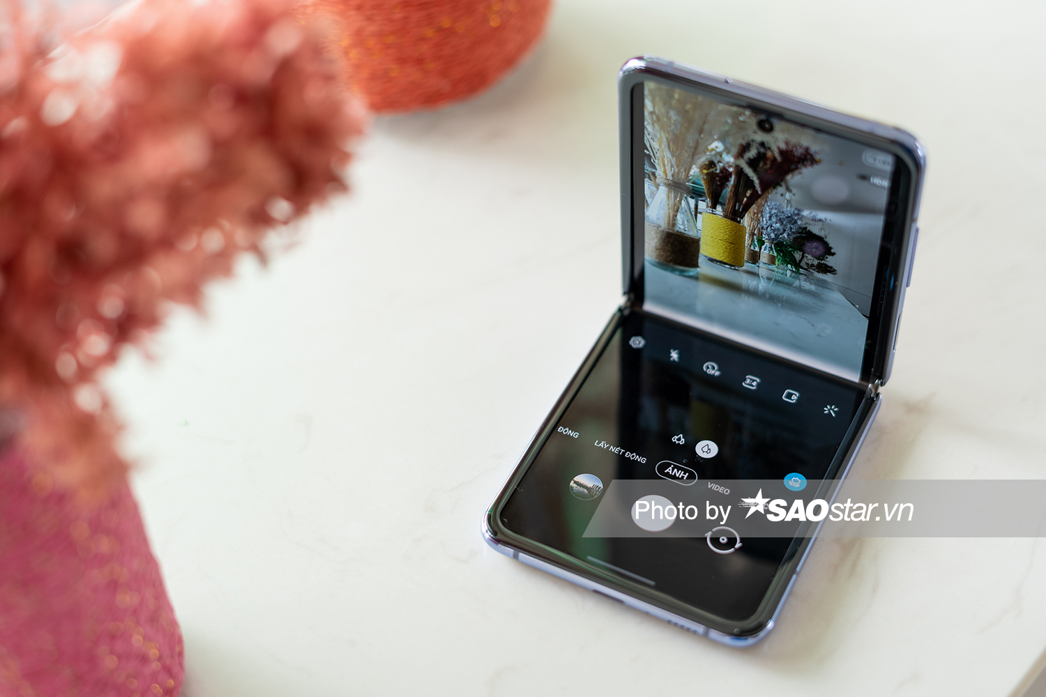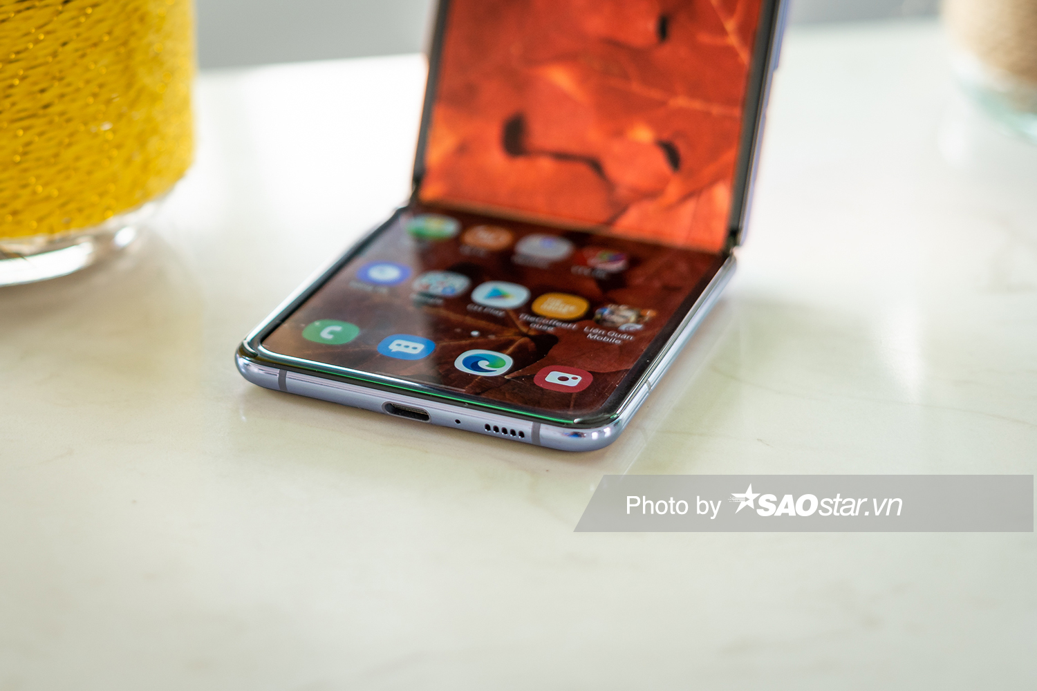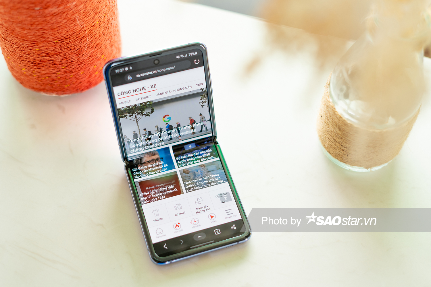 Samsung Galaxy Z Flip có thể sử dụng ở nhiều góc độ khác nhau. Phần nếp gấp màn hình ở khu vực bản lề khó nhận ra hơn so với những gì có trên chiếc Fold.