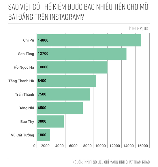 Với 2,6 triệu người theo dõi, Chi Pu ở thời điểm hiện tại đang là một trong những người được theo dõi nhiều nhất trong cộng đồng người dùng Instagram Việt Nam. Theo công cụ được phát triển bởi inkifi, mỗi bài đăng của cô nàng này được định giá lên tới 14,8 nghìn USD, tương đương hơn 346 triệu đồng. Tương tự, Sơn Tùng, với tài khoản Instagram có 2,2 triệu người theo dõi, có thể kiếm được khoảng 12,7 nghìn USD cho mỗi bài đăng.