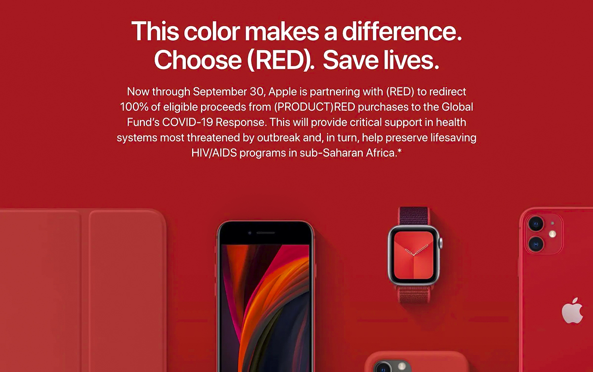 Trong lịch sử nhiều năm đồng hành cùng (RED), Apple từng cho ra mắt nhiều dòng sản phẩm kết hợp cùng chiến dịch (RED) như MacPro, iPod Shuffle, iPod Nano, ốp lưng, iPhone 7/ 7 Plus, iPhone 8/8 Plus, iPhone Xr,… và mới đây là iPhone SE 2020.