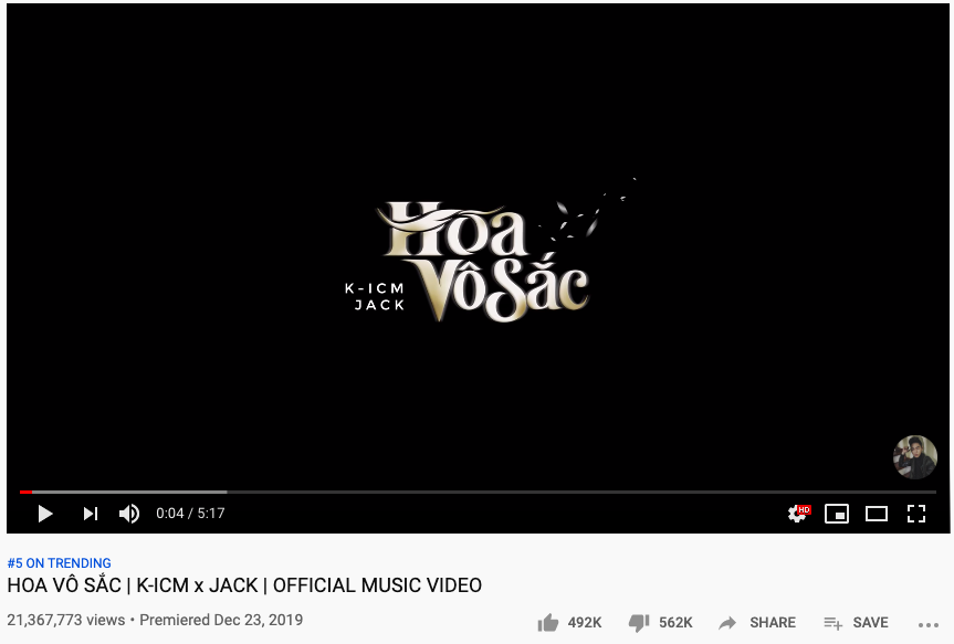 Chính thức lên sóng từ ngày 23/12, tính đến thời điểm thực hiên bài viết, MV “Hoa vô sắc” của bộ đôi Jack và K-ICM đã chính thức thu về 21,36 triệu lượt xem và vẫn thu hút được khá nhiều sự quan tâm từ người hâm mộ, bằng chứng là việc nó vẫn đang xếp thứ 5 trong bảng xếp hạng các video xu hướng (trending) tại Việt Nam.
