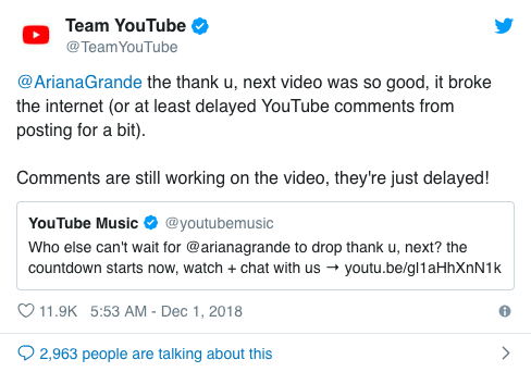 Điểm thú vị là dường như “thank u, next” đã tăng view nhanh đến mức làm “hỏng” chức năng bình luận của YouTube. Cụ thể, trang Twitter chính thức của YouTube cũng thừa nhận vấn đề này khi cho biết số lượng người xem và bình luận lớn đã khiến bình luận trên YouTube cho MV này bị dính lỗi chậm hiển thị. “Bình luận vẫn hoạt động trên video, chúng chỉ bị chậm mà thôi!” tài khoản Twitter Tea YouTube cho biết. Một người phát ngôn của YouTube cho biết công ty này đang giải quyết vấn đề tuy nhiên chưa đưa ra mốc thời gian cụ thể nó có thể được giải quyết.