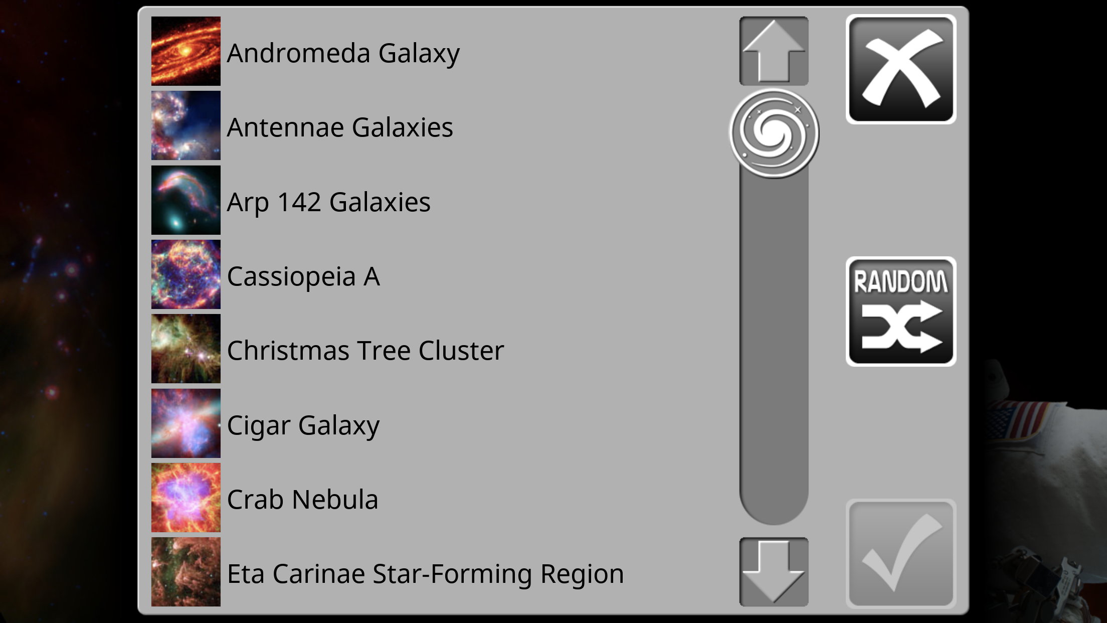 Sau đó, hãy nhấn vào biểu tượng Select để lựa chọn các hình ảnh thiên hà, chòm sao được chụp bởi kính viễn vọng Spitzer mà bạn muốn làm nền. Nếu muốn chụp một bức ảnh khác, bạn hãy ấn vào biểu tượng New bên trái giao diện.