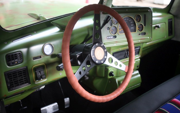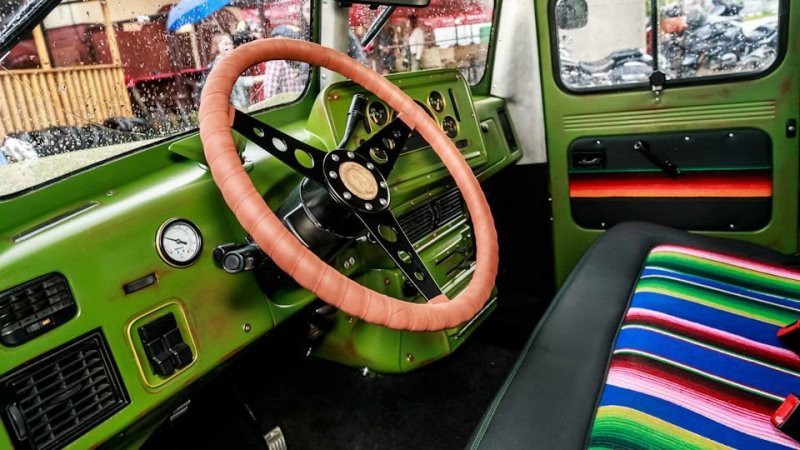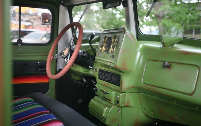 Phần nội thất cũng được phủ lớp sơn xanh, với các chi tiết là vải poncho Mexico được vận chuyển từ Nam Mỹ đến.