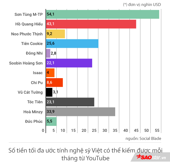 Theo số liệu của SocialBlade, Sơn Tùng M-TP đang là nghệ sỹ sở hữu kênh YouTube có thể giúp anh kiếm được tới tối đa trên dưới 54 nghìn USD mỗi tháng. Hồ Quang Hiếu, Hoà Minzy, Tóc Tiên, Soobin Hoàng Sơn hay Tiên Cookie là một số nghệ sỹ cũng có thể kiếm được từ trên 20 nghìn USD mỗi tháng nhờ kênh YouTube của mình. SocialBlade không giải thích cách thức mà họ đưa ra được những con số ước tính này, tuy nhiên nó có thể phụ thuộc vào nhiều yếu tố như lượng người theo dõi, tần suất đăng video, số lượng xem mỗi video… của các kênh video.