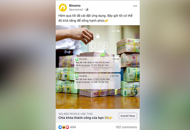Vẽ ra lợi nhuận khủng, phủ sóng trên nhiều nền tảng mạng xã hội, tạo uy tín bằng cách thuê người nổi tiếng, làm tin giả là công thức tiếp cận “con mồi” của ứng dụng cá cược Binomo. Hiện quảng cáo của Binomo vẫn liên tục xuất hiện trên Facebook, Google, Instagram và Cốc Cốc.