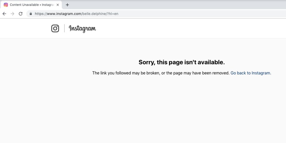 Trước đó, Belle Delphine sở hữu một tài khoản có tới 4,5 triệu người theo dõi. Cô vốn nổi lên sau khi thực hiện “chiêu trò” bán nước tắm với giá 30 USD một lọ. Thế nhưng, mới đây, tài khoản của cô đã bị hạ xuống. Thay vào đó là một dòng chữ được hiển thị rằng “Sorry, this page isn't available.” (Tạm dịch: Xin lỗi, trang này không còn khả dụng.)