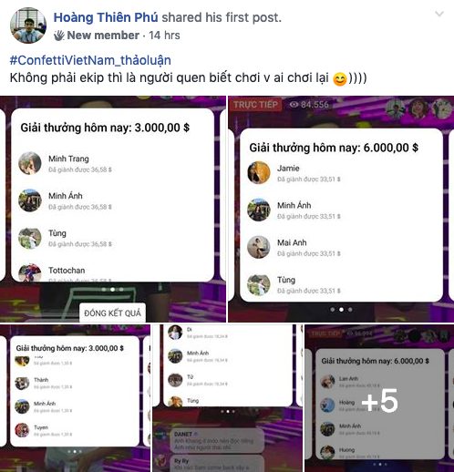 Khi “săm soi” danh sách những người trúng thưởng, không ít người chơi Confetti Vietnam bất ngờ khi nhận ra có rất nhiều người liên tục thắng giải, cho dù số lượng người trúng giải hôm đó là ít hay nhiều, đồng nghĩa với việc câu hỏi khó hoặc dễ thở hơn. Đáng nói hơn là một số thành viên liên tục trúng giải này dường như còn có sự liên quan với MC Nguyên Khang khi đã từng tương tác một cách khá thân thiết trên Facebook của MC này.