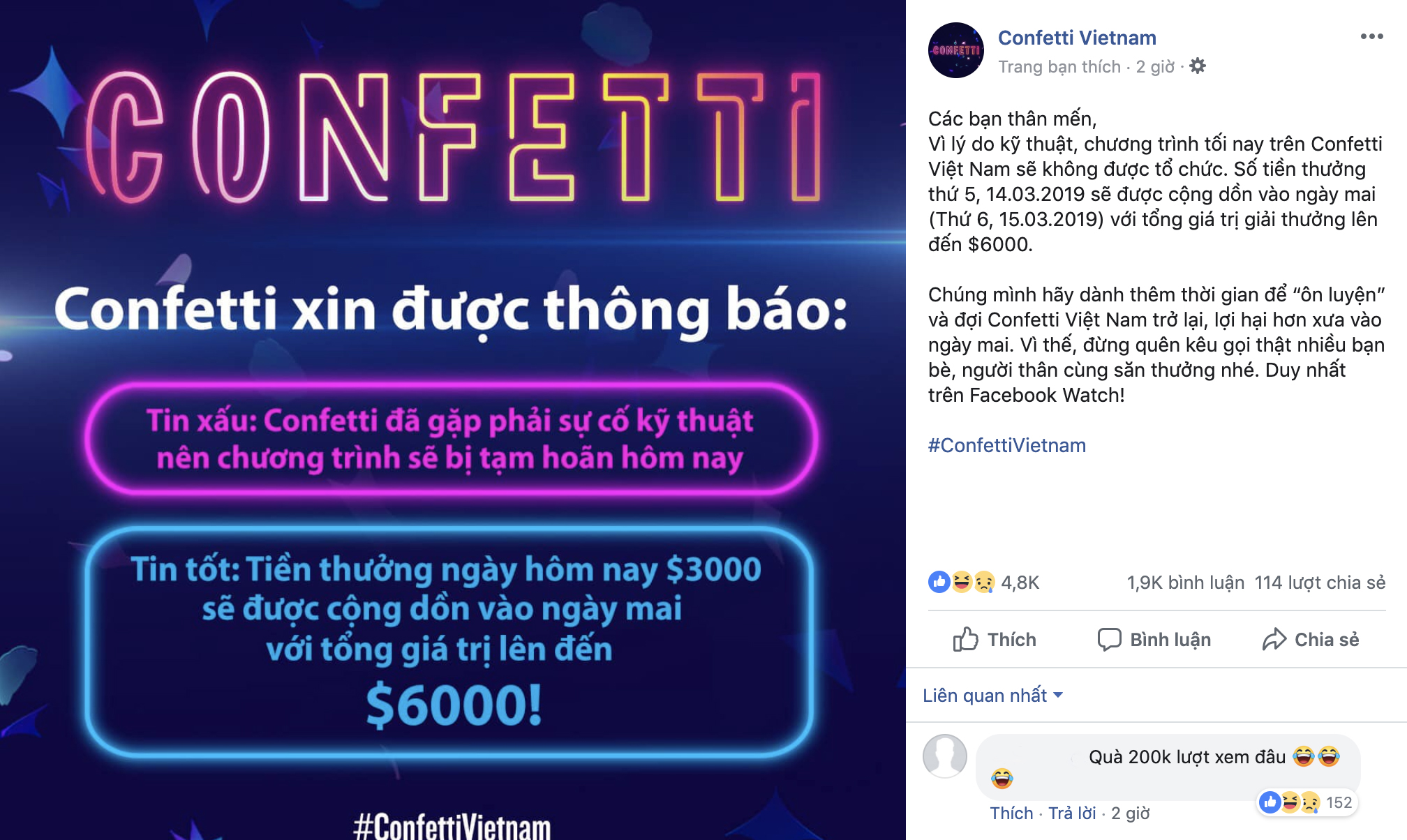 Chúng mình hãy dành thêm thời gian để “ôn luyện” và đợi Confetti Việt Nam trở lại, lợi hại hơn xưa vào ngày mai. Vì thế, đừng quên kêu gọi thật nhiều bạn bè, người thân cùng săn thưởng nhé. Duy nhất trên Facebook Watch!”.