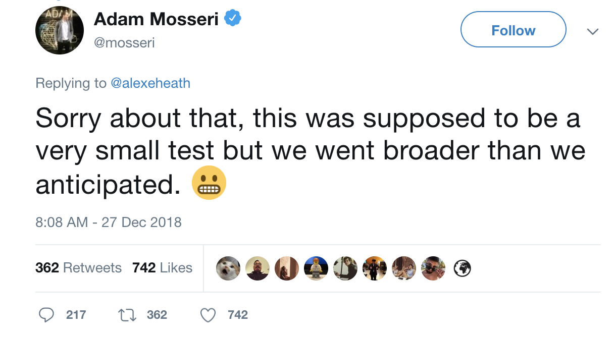 Thay đổi mới lạ này khiến không ít người dùng Instagram phàn nàn trên Facebook, Twitter. Sau đó, phía Instagram cũng mau chóng thu hồi bản cập nhật và đưa ra giải thích rằng đây là một sai sót trong quá trình đưa ra các bản thử nghiệm.