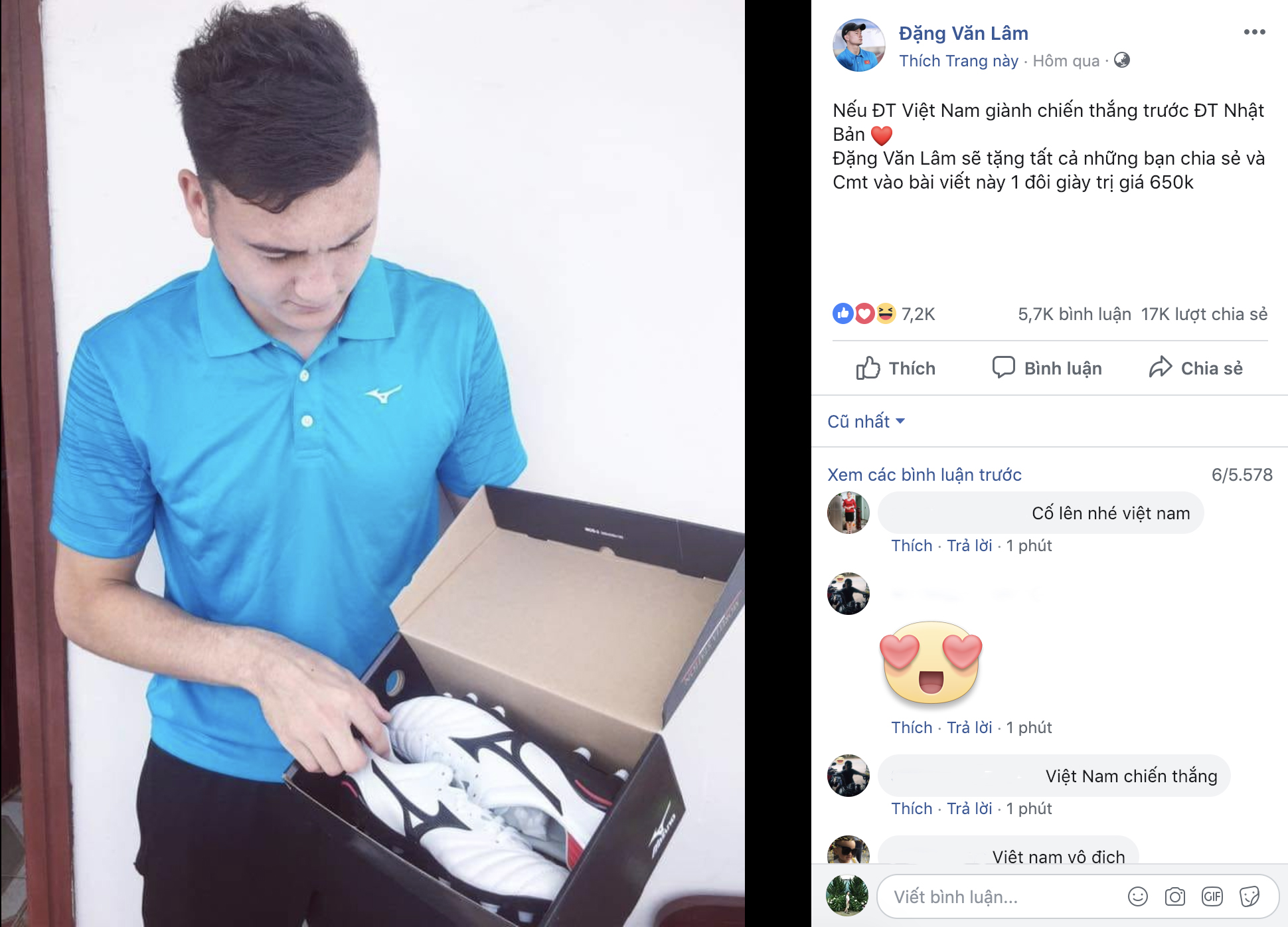 Cụ thể, rất nhiều người hâm mộ tuyển Việt Nam đang chia sẻ một bài đăng từ trang cá nhân có tên @dangvanlam365.official với nội dung “tặng tất cả những bạn chia sẻ và comment vào bài viết này 1 đôi giày trị giá 650k”.