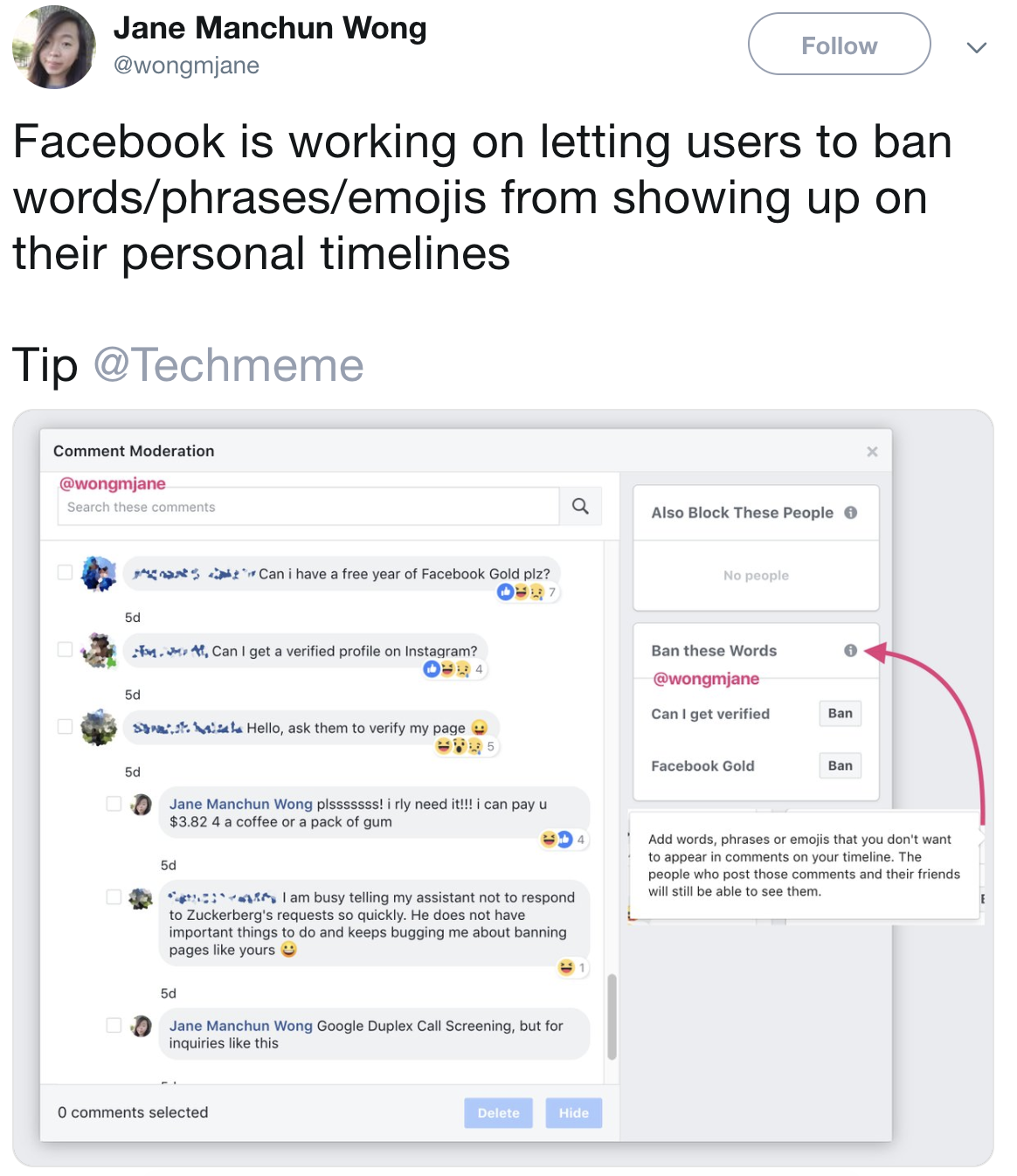 Được biết, Jane Manchun Yong - sinh viên đang học ngành công nghệ tại Đại học Hồng Kong đã phát hiện ra tính năng mới này. Tuy nhiên, tính năng mới mà Facebook đang thử nghiệm theo Yong hiện hoạt động chưa được hoàn thiện. Đến thời điểm hiện tại thì nó gần như chỉ ẩn đi các thông báo về nội dung đã post chứ không thực sự chặn hoàn toàn. Lý do là vì bản thân người post nội dung bị chặn và bạn bè của những người này vẫn có thể nhìn thấy nội dung này.