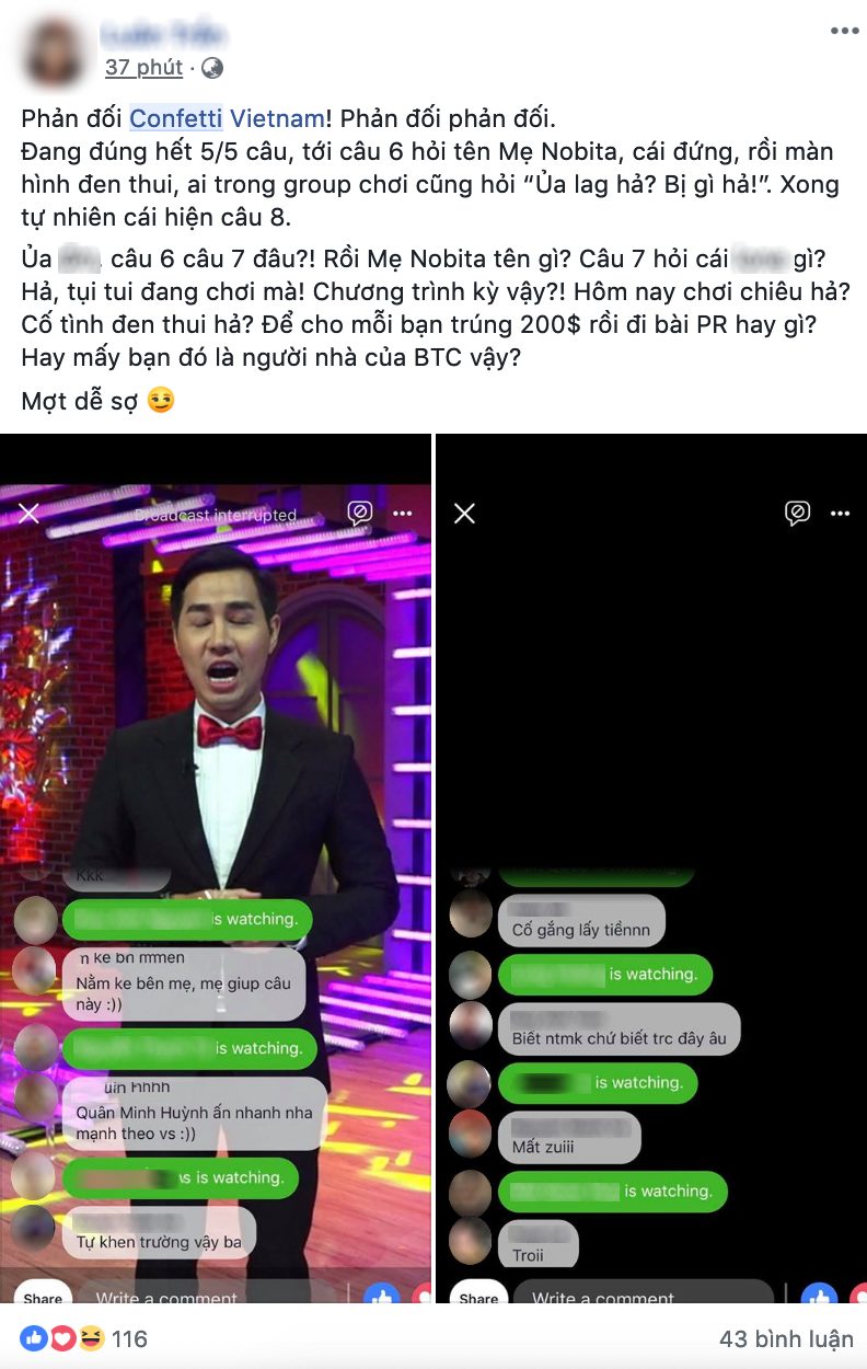 Một người chơi Confetti Việt Nam bức xúc trên Facebook, bản thân anh đã đúng hết 5/5 câu nhưng tới câu 6 chưa kịp trả lời thì thì màn hình trò chơi bỗng chuyển thành đen có hiện tượng giật, lag. Chưa kịp định hình thì Confetti Việt Nam đã chuyển sau câu hỏi thứ 8. Dù chưa biết nguyên nhân sự việc nhưng tài khoản này nghi vấn Confetti Việt Nam đang gian lận, tung “hoả mù” để PR cho chương trình.