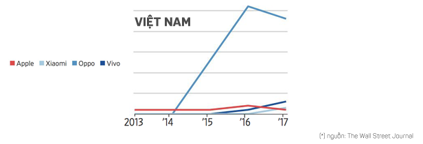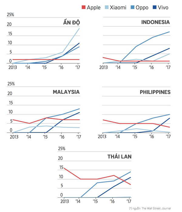 Theo số liệu WSJ công bố, thị phần smartphone Apple đang nắm giữ trong vài năm trở lại đây có xu hướng đi ngang và thậm chí giảm tại nhiều thị trường ở Châu Á như Ấn Độ, Indonesia, Philippines, Malaysia, Thái Lan và Việt Nam. Cùng thời điểm, các thương hiệu smartphone Trung Quốc lại đang phất lên như diều gặp gió.