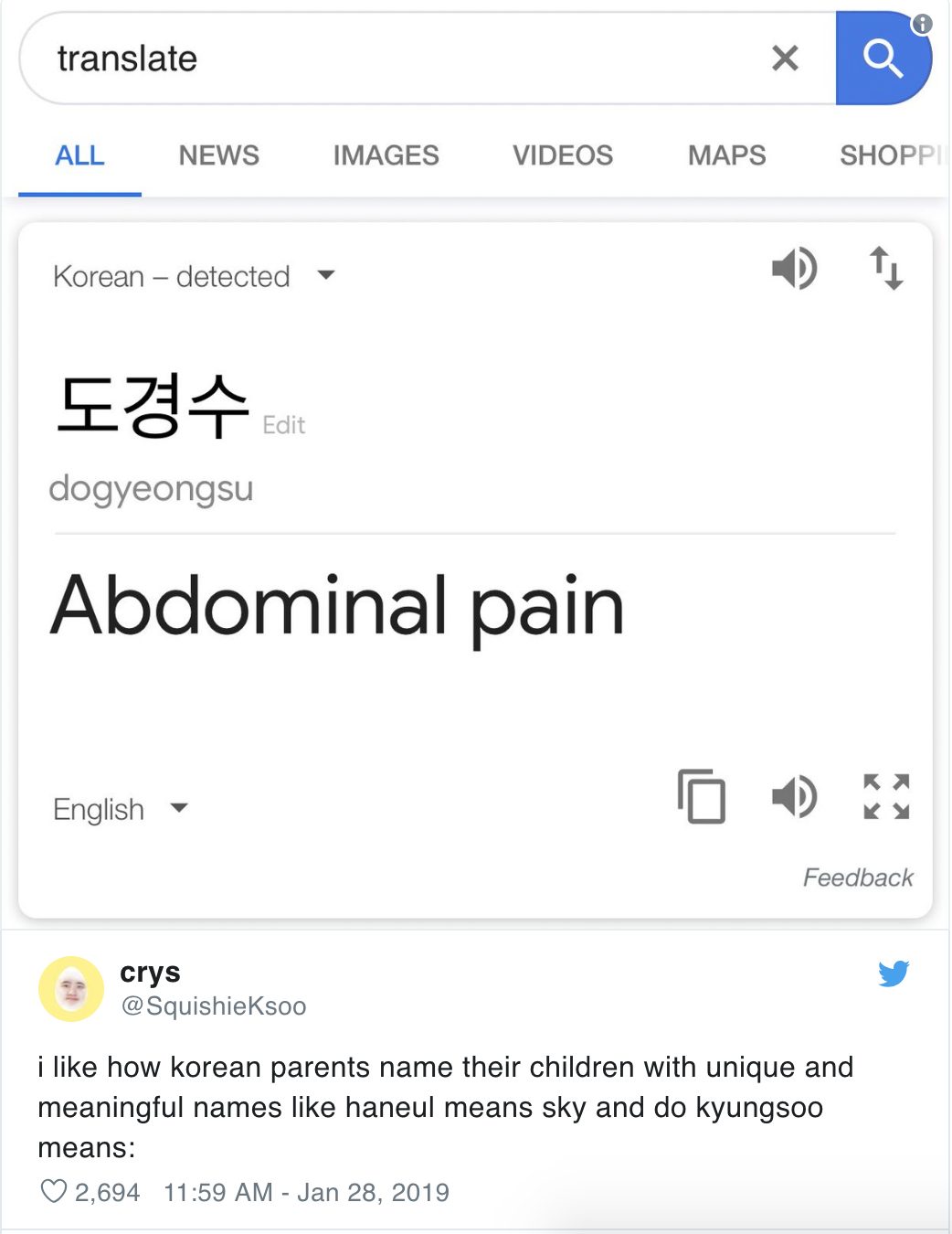 Theo đó, một fan hâm mộ của anh chàng có tên tài khoản @SquishieKsoo đã thử xem kết quả dịch của “chị Google” lợi hại thế nào khi dịch tên đầy đủ của D.O, Do Kyungsoo, sang tiếng anh. Khi gõ “도경수” vào công cụ dịch của Google, fan hâm mộ này đã cười xỉu khi nhận được kết quả là “Abdominal pain” (đau bụng).