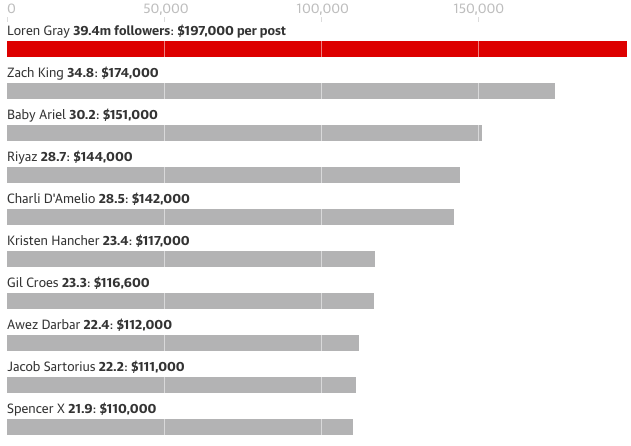 Loren Gray, một ca sĩ 17 tuổi từ Pennsylvania, được xem là một trong những người dùng TikTok thành công nhất ở khía cạnh marketing ở thời điểm hiện tại, có thể kiếm được 197.000 USD cho mỗi bài đăng, theo nghiên cứu.