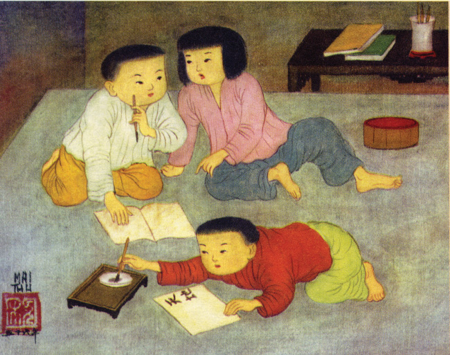 Bức họa “Tập viết” được danh họa vẽ vào năm 1956 cũng được dân mạng biến tấu thành người chị chỉ dạy em học bài nhưng theo phong cách hài hước, dễ thương. (Ảnh: Wikipedia/Pinterest)