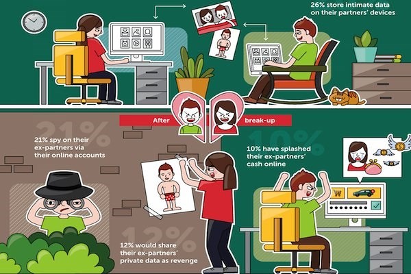 Đặc biệt phải kể đến, có khoảng 12% kẻ thất tình đã chia sẻ, hoặc có ý định chia sẻ những thông tin nhạy cảm của người yêu cũ như một cách trả thù cá nhân. Khoảng 21% người cũng thừa nhận là đã hoặc đang theo dõi người yêu cũ trên các tài khoản trực tuyến mà cá nhân họ từng truy cập. Ngoài ra, có khoảng 10% người khảo sát cho biết họ đã sử dụng tài khoản trực tuyến của người yêu cũ để thanh toán chi phí mà bản thân đối phương không hề hay biết.
