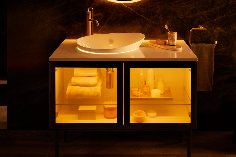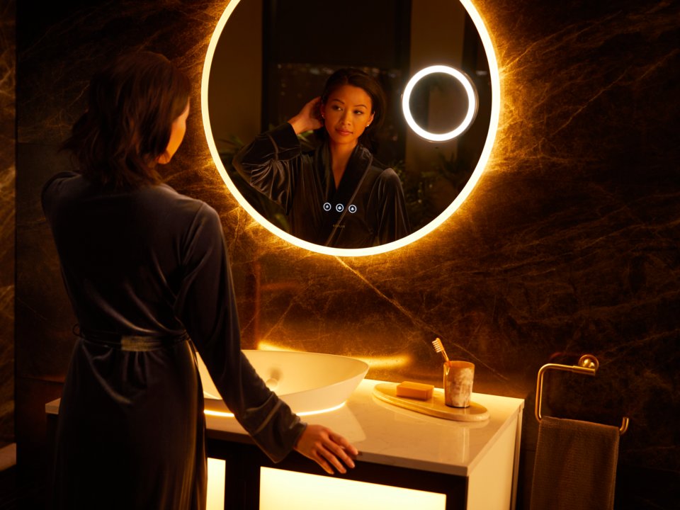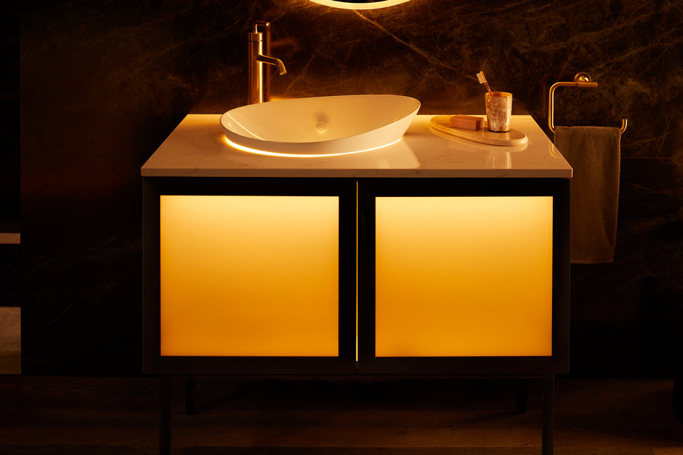 Bộ sản phẩn này theo đó bao gồm gương, tủ đồ, toilet thông minh và bồn tắm - tất cả đều có thể được kích hoạt bằng giọng nói hoặc chuyển động để điều khiển nhiệt độ màu của ánh sáng. Được biết, đây là kết quả của sự hợp tác giữa Signifi, tiền thân là Philips Lighting, một trong những công ty chiếu sáng kết nối hàng đầu thế giới.