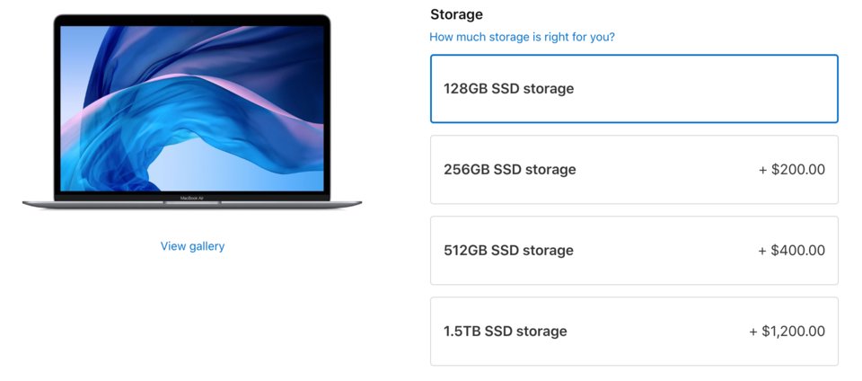 Một chiếc laptop có 128 GB bộ nhớ trong - 30 GB trong số đó sẽ là chỗ của hệ điều hành - với mức giá gần 1.200 USD là một điều kì quặc và điều này còn kì quặc hơn nữa khi bạn phải bỏ thêm 200 USD để nâng cấp lên phiên bản 256 GB. Apple hoàn toàn có thể “bố trí” cho chiếc MacBook Air mới một đầu đọc thẻ nhớ microSD hay hỗ trợ cơ chế bộ nhớ trong có thể mở rộng hoặc thậm chí đơn giản hơn là nâng cấp dung lượng bộ nhớ trong tối thiểu lên một mức hợp lý hơn là 256 GB, nếu chưa muốn nói là 500 GB.