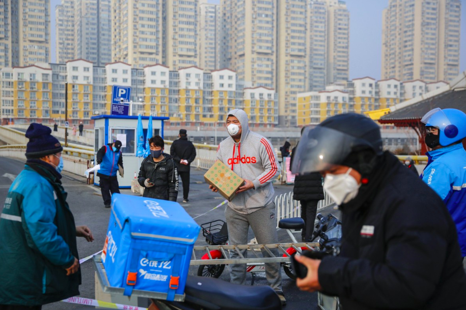Một khách hàng đeo khẩu trang nhận hàng từ nhân viên giao hàng tại Bắc Kinh. (Ảnh: EPA-EFE)