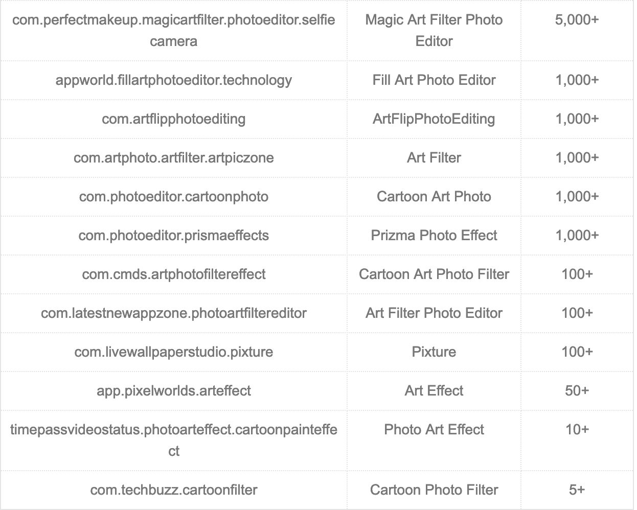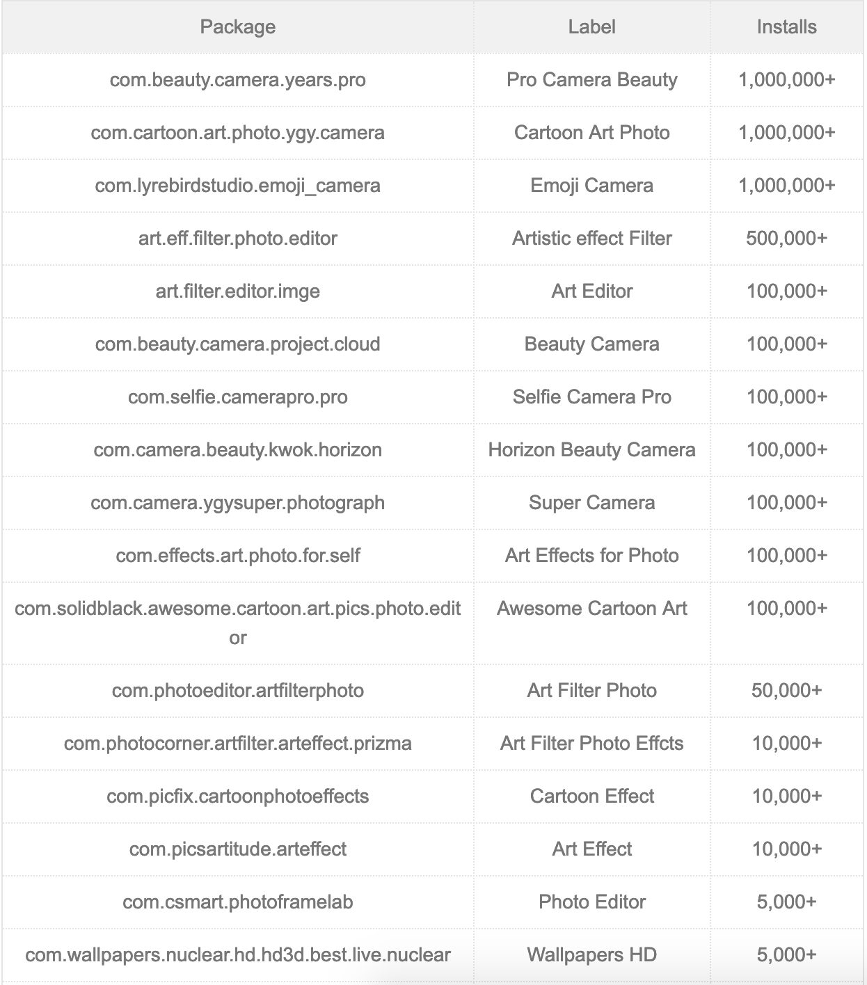 Cụ thể, Trend Micro đã tìm thấy 29 ứng dụng về camera và làm đẹp trên Google Play có chứa các loại mã độc bên trong. Các ứng dụng này được nhiều người dùng tại các nước châu Á ưa chuộng bởi tính năng làm da mặt thông qua các bộ lọc màu cũng như chỉnh sửa hình ảnh.