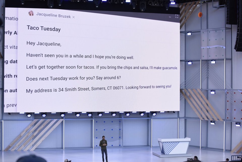 CEO Google Sundar Pichai giới thiệu một tính năng hoàn toàn mới mang tên Duplex mà người dùng có thể hỏi Google Assistant để gọi cho các đơn vị kinh doanh thay cho bạn và tính năng thông minh nhân tạo (AI) của Google sẽ đặt lịch hẹn cho bạn. Điều này hoàn toàn có thật.
