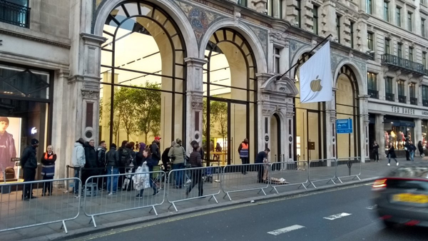 Sau gần nửa tiếng bán ra, bên ngoài Apple Store tại Anh vẫn có hàng trăm người xếp hàng.
