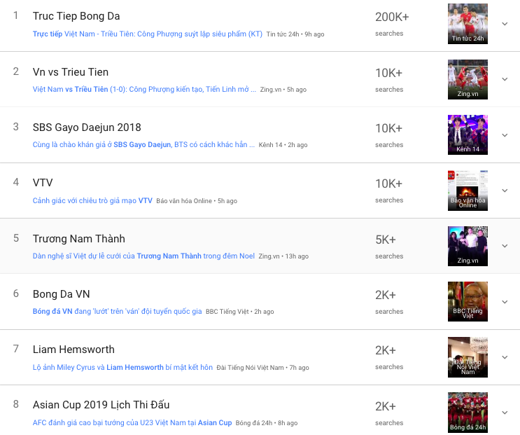 Xunh quanh và trong thời điểm diễn ra trận đấu, có tới 5 trên 8 từ khoá được tìm kiếm nhiều nhất trên Google trực tiếp liên quan đến bóng đá Việt Nam. Các từ khoá như “Truc Tiep Bong Da” hay “VN vs Trieu Tien” thậm chí còn nhận được lưu lượng tìm kiếm cao hơn từ khoá “SBS Gayo Daejun 2018” - một show diễn tổng kết năm 2018 với nhiều màn trình diễn đỉnh cao từ sao Hàn như BlackPink, BTS, EXO, Wanna One… được nhiều người chờ đón.