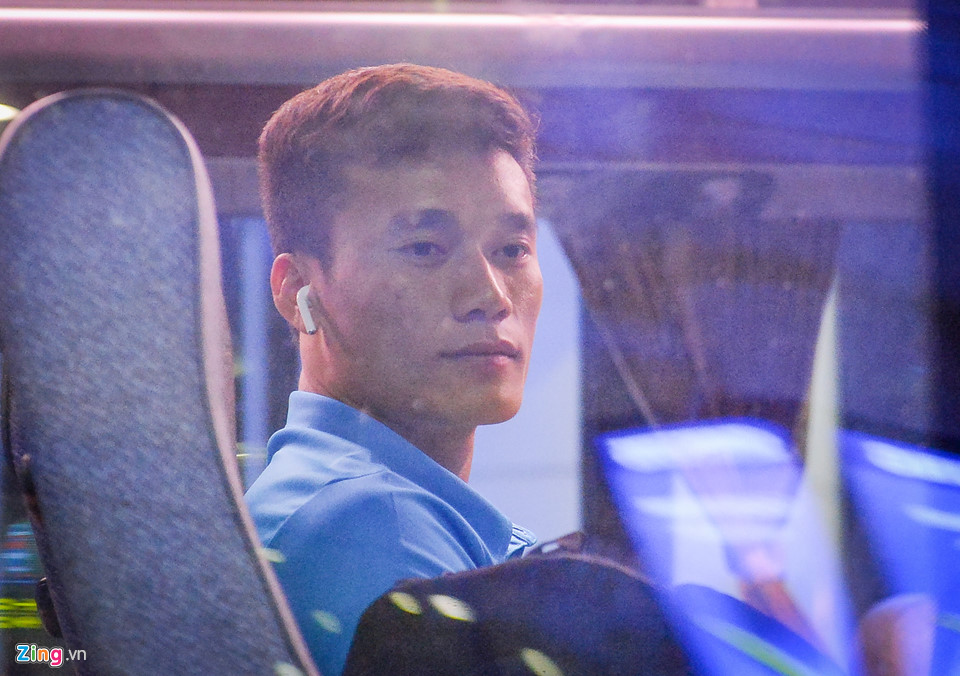 Trở về Việt Nam sau chiến thắng ba sao với đội tuyển Lào trong trận đấu đầu tiên tại AFF Cup 2018, thủ môn Bùi Tiến Dũng ngồi bình thản trên xe buýt với chiếc tai nghe AirPods. Anh không ra sân trong trận đấu này. (Ảnh: Zing)