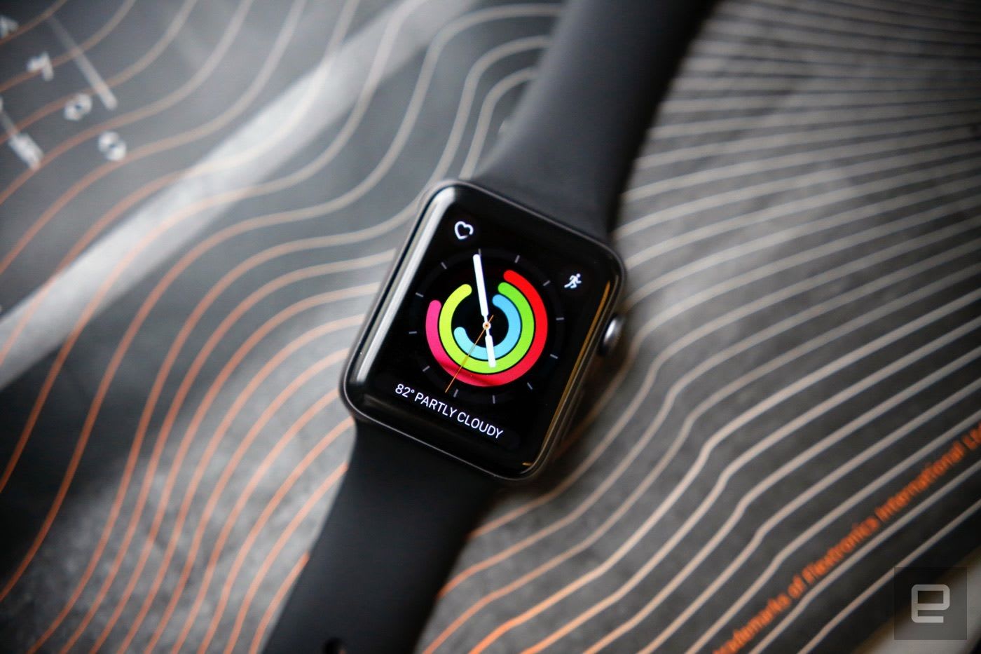 2017: Series 3 đánh dấu một cột mốc quan trọng của Applw Watch khi nó được trang bị kết nối dữ liệu di động LTE, cho phép người dùng gọi điện thoại, gửi tin nhắn, nghe nhạc từ Apple Music và nhiều tác vụ khác mà không cần một chiếc iPhone bên cạnh. Series 3 bên cạnh đó cũng có con chip S3 có hiệu năng cải thiện 70%, cảm biến thước đo khí áp để đo độ cao cùng với đó là con chip W2 cải thiện tốc độ kết nố Wi-Fi thêm tới 85% và tiết kiệm dung lượng pin 50%. (Ảnh: Engadget)