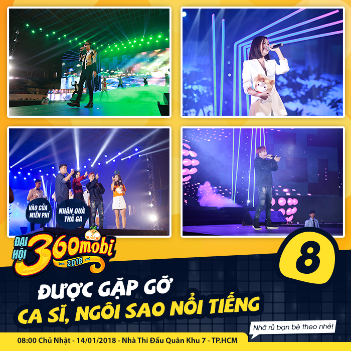 Chắc hẳn các game thủ cũng còn nhớ trong lần tổ chức gần đây nhất, Đại hội 360mobi đã mời đến sự kiện này khá nhiều ca sĩ nổi tiếng như Soobin Hoàng Sơn, Lou Hoàng, Bích Phương… Trong lần Đại hội 360mobi 2018 này, cộng đồng game thủ sẽ được thấy Tóc Tiên, Chi Dân, Đen Vâu, Kimese, Nhóm Uni5, Nhóm HKTM - The Five “quẩy tung” trên sân khấu. Còn chờ gì mà không đi xem luôn cho nóng!