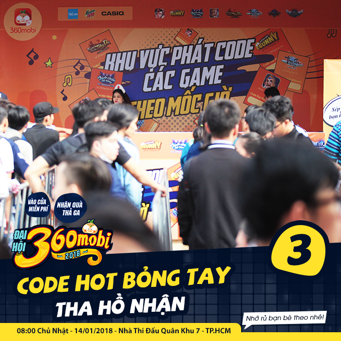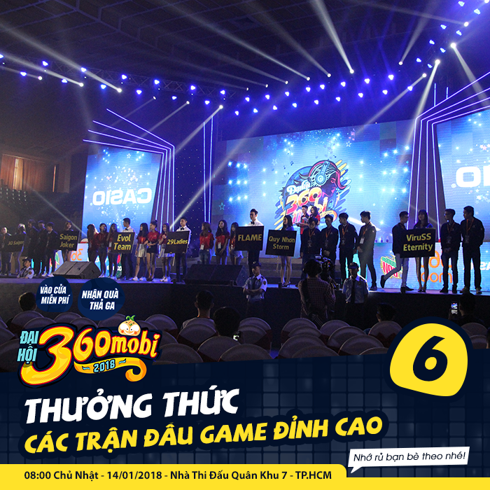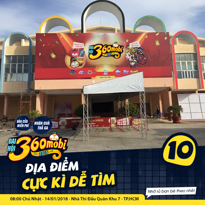“Tấm thiệp mời trên bàn - Thời gian địa điểm rõ ràng!” Đại hội 360mobi 2018 sẽ bắt đầu vào 8 giờ sáng ngày 14.1.2018 (tức ngày Chủ Nhật) tại Nhà thi đấu Quân khu 7 (địa chỉ: 202 Hoàng Văn Thụ, Q. Phú Nhuận, TP. HCM). Đây là một trong số những địa điểm tổ chức sự kiện hoành tráng bậc nhất tại khu vực phía Nam và sẽ toàn tâm phục vụ các game thủ tại Đại hội 360mobi 2018 sắp tới.