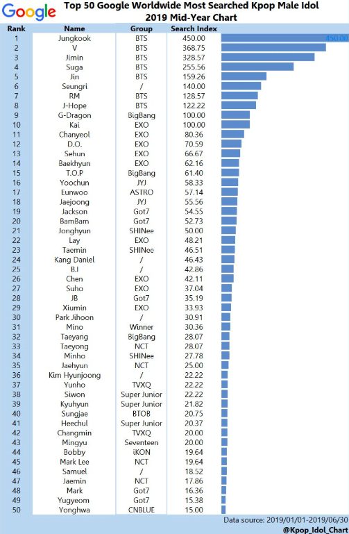 Theo đó, trong số 10 vị trí dẫn đầu của bảng xếp hạng thì có tới 7 thành viên thuộc nhóm nhạc BTS với cái tên dẫn đầu là Jungkook cùng điểm tìm kiếm 450. V, Jimin, Suga và Jin lần lượt xếp ở các vị trí tiếp theo trong top 5 với điểm tìm kiếm 368,75; 328,57; 255,56 và 159,26. RM và J-Hope trong khi đó xếp ở vị trí số 7 và số 8. Như vậy, trong top 10 các nam nghệ sĩ được tìm kiếm nhiều nhất chỉ còn lại ba vị trí dành cho các nhân vật không đến từ BTS là Seungri (vị trí số 7, điểm tìm kiếm 140), G-Dragon (vị trí số 9, điểm tìm kiếm 100) và Kai (vị trí số 10, điểm tìm kiếm 100).