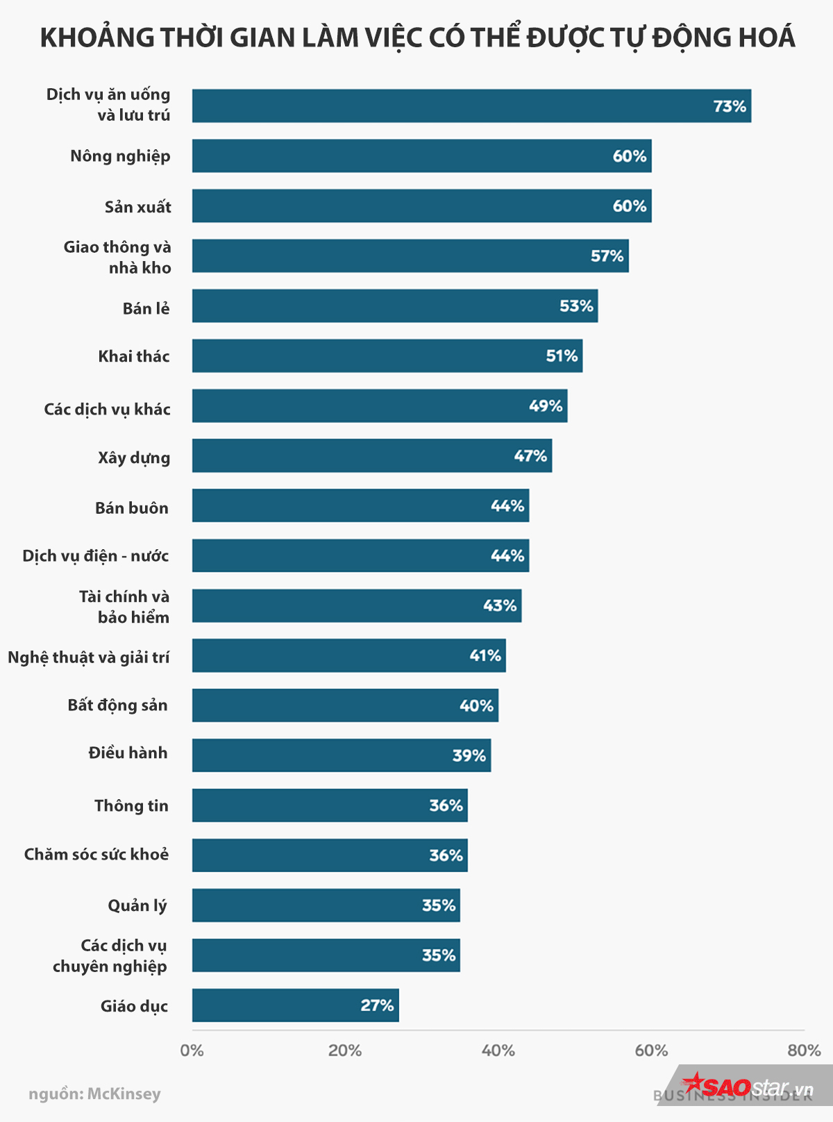 Sử dụng dữ liệu từ Bộ Lao động Hoa Kỳ, công ty tư vấn McKinsey từng tung ra một báo cáo trong đó tổng hợp số lượng thời gian các nhân sự đang dành ra để thực hiện các tác vụ khác nhau trong công việc và số lượng các công việc trong đó có thể được tự động hoá dựa vào công nghệ hiện tại.