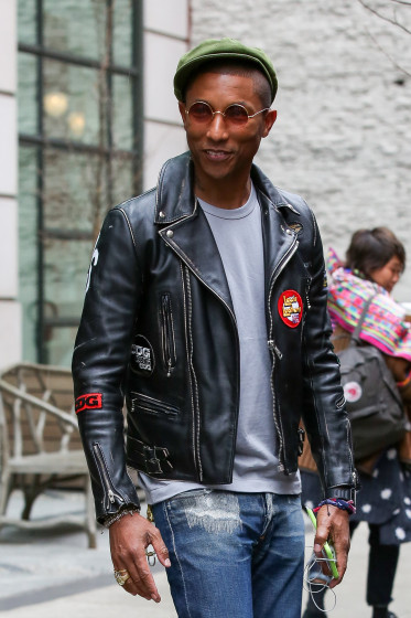 Pharrell Wiliams bước ra ngoài từ một khách sạn ở New York cùng một chiếc iPhone trên tay.