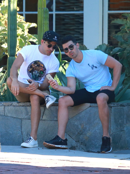 Joe Jonas đang cho một người bạn xem thứ gì đó trên chiếc iPhone của mình.