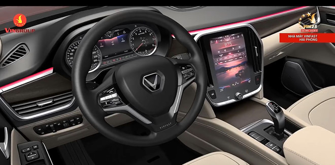 Thực tế, hình ảnh xuất hiện trong đoạn video chỉ cho thấy một phần nội thất của chiếc xe. Tuy nhiên nó cũng cho thấy nội thất chiếc xe khá sang trọng và tinh tế với các chi tiết ốp gỗ cùng phần ghế bọc da màu ghi. Vô lăng chiếc xe 3 chấu được thiết kế với phong cách thể thao khá khoẻ khoắn cùng một số nút bấm tương tác giúp người dùng có thể gọi điện thoại rảnh tay, điều chỉnh âm lượng… Ngoài ra, quan sát cũng cho thấy nội thất xe có một màn hình thông tin giai trí cùng cửa điều hoà nằm hai bên. Điểm nhấn trong nội thất chiếc xe nằm ở logo chữ V của Vinfast.