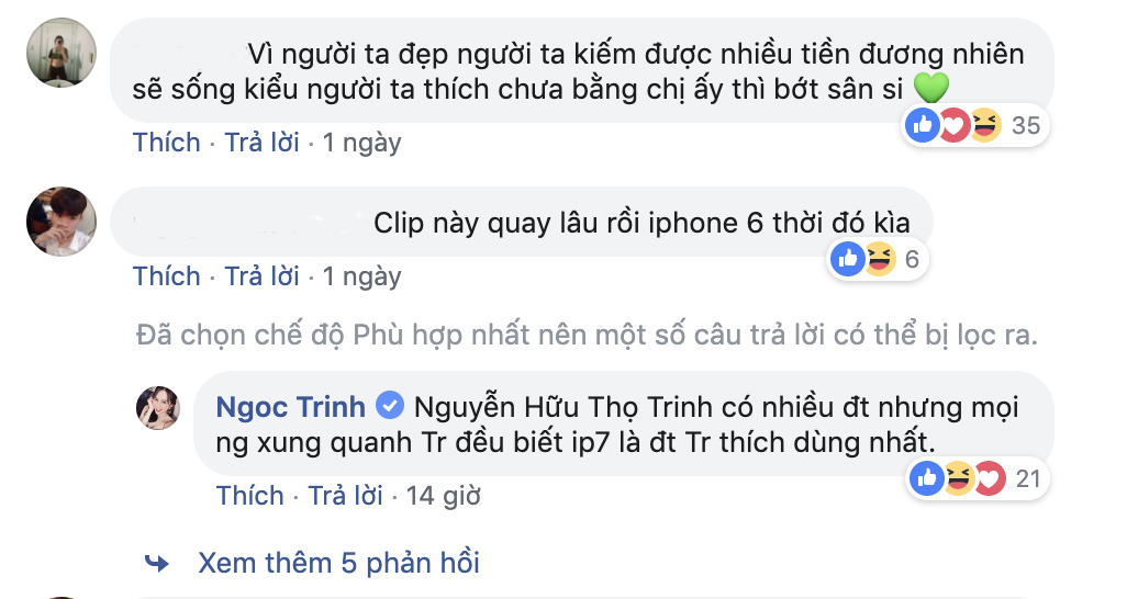 Theo đó, một người dùng Facebook đã bình luận rằng “clip này được quay lâu rồi vì Ngọc Trinh đang cầm trên tay iPhone 6”. Tuy nhiên, người đẹp Trà Vinh đã đính chính rằng đó là dòng điện thoại iPhone 7 và khẳng định đây là chiếc iPhone mà cô thích nhất. Điều này khiến không ít cộng đồng mạng bất ngờ vì ai cũng nghĩ, với danh tiếng đình đám như Ngọc Trinh thì ắt hẳn cô cũng đang sử dụng những chiếc iPhone X, Xs/Xs Max sang chảnh giá ngàn đô.