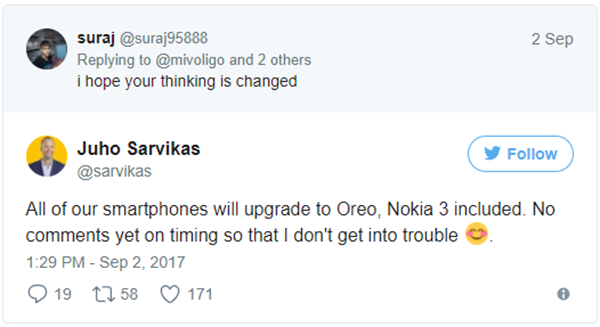 Trích lời ông Juho Sarvikas, toàn bộ smartphone Nokia kể cả 'chú dế' giá rẻ là Nokia 3 sẽ được lên phiên bản Android mới nhất 8.0 Oreo trong thời gian tới. Tuy nhiên, ông cũng tránh công bố về thời gian cập nhật để tránh rắc rối.